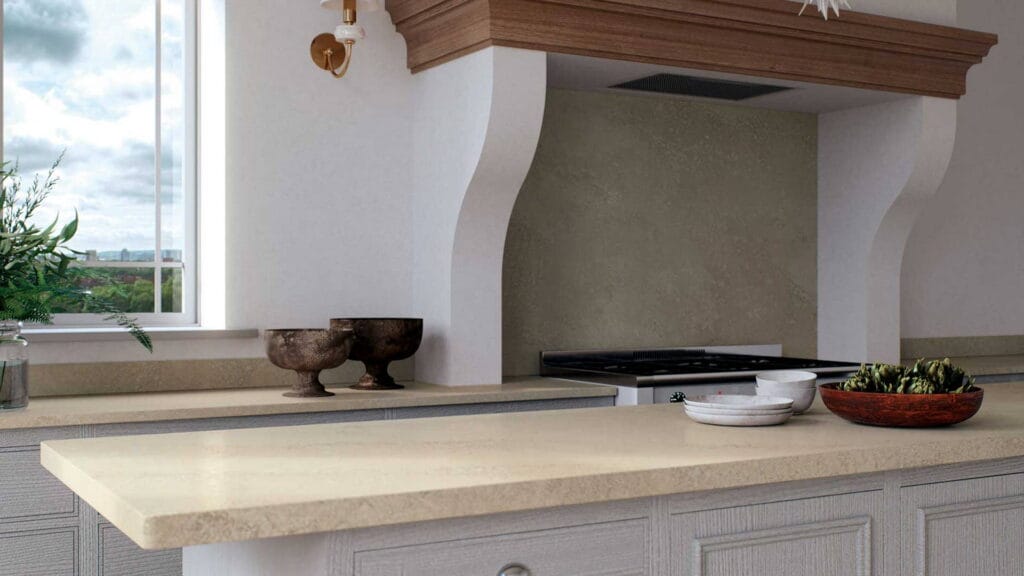 5222 Adamina is a refined crystalline silica-free mineral surface, exclusively offered at Bamby Stone. Featuring a neutral putty-toned base, it is artfully overlaid with taupe veining and delicate layers of earthy sands, creating a serene, grounded effect that evokes desert landscapes and natural warmth. This slab reflects a harmonious blend of modern design sensibility and timeless natural stone inspiration.