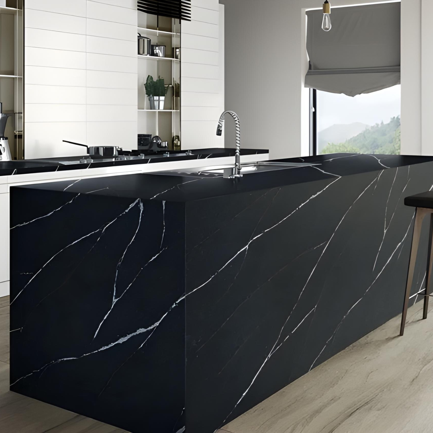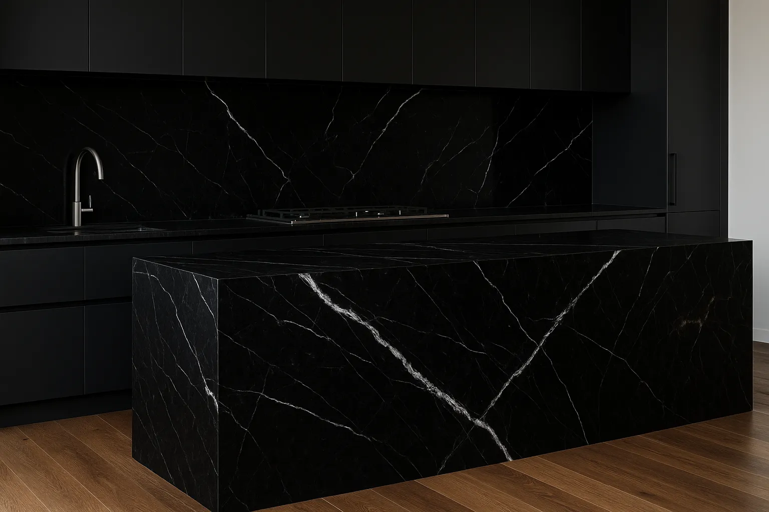 Alexander Black is a premium black marble from Turkiye’s Amanos region, ideal for benchtops, vanities, office desks, floors, and wall cladding. A symbol of honesty, mystery, and confidence.