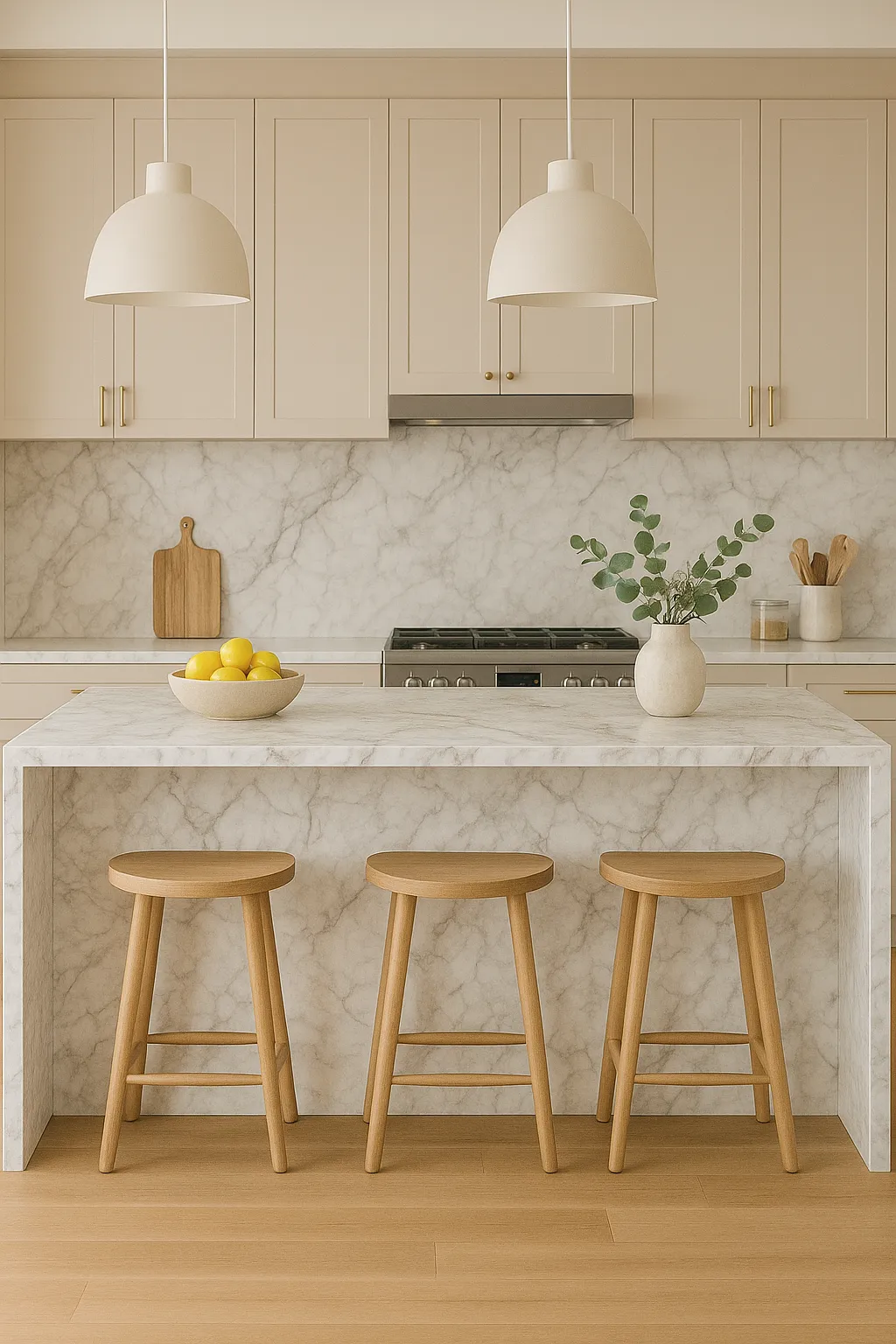 Glasé Honed Marble with a creamy white base and flowing grey veining, ideal for kitchen benchtops and timeless interiors.