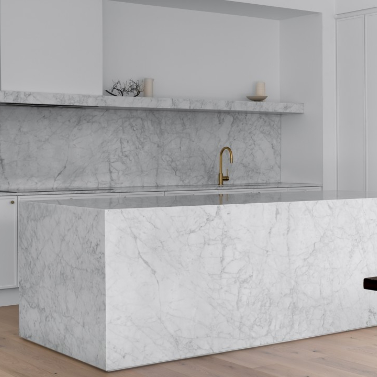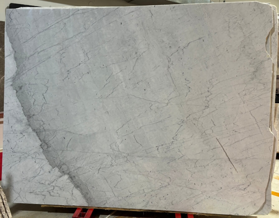 Carrara (Stibnite) is a polished bookmatch stone from Italy, blending white, cream, and cloudy grey tones. Perfect for counters, floors, walls, and feature installations.