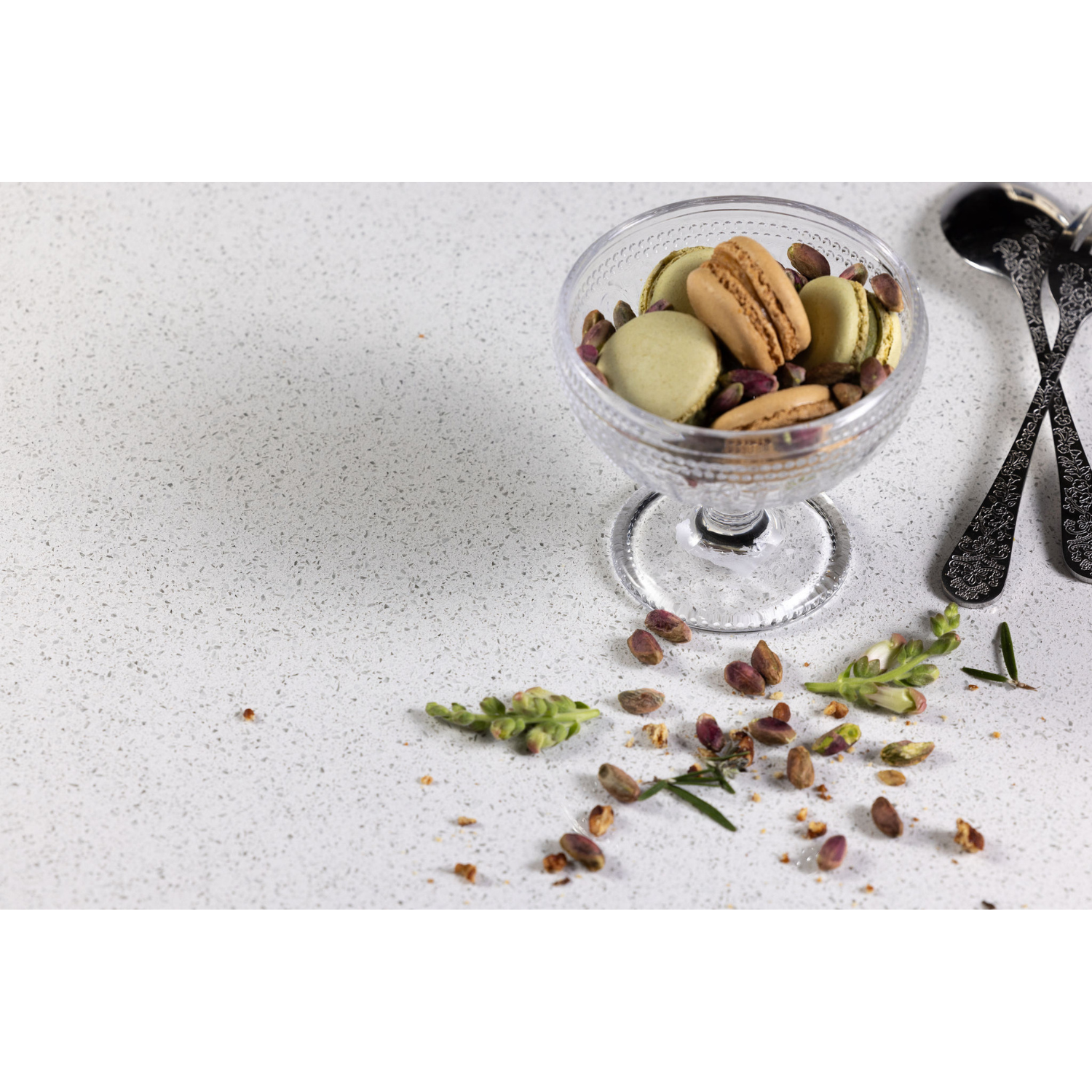 Crystal is a polished silica-free mineral crystalline sintered stone, featuring embedded jeweled flecks for a shimmering effect. Features Alpha Shield protection. Ideal for benchtops, vanities, and feature surfaces.