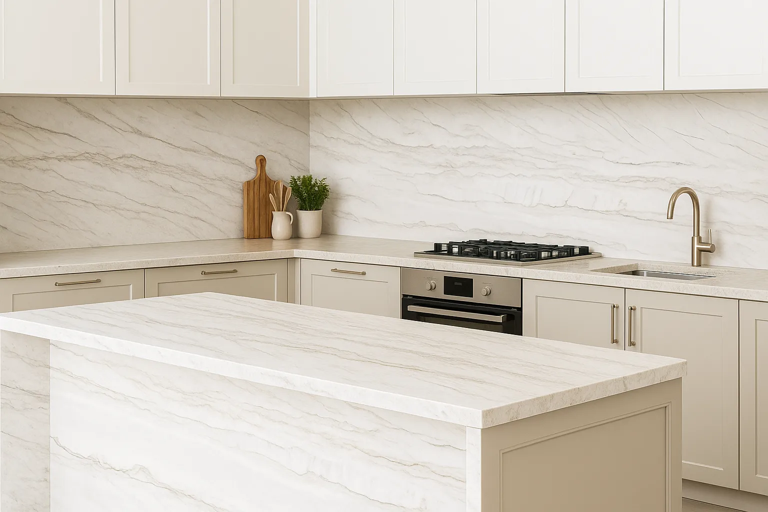 Honed Quartzite with a white base, taupe-grey veining, and beige undertones, ideal for kitchen benchtops and natural, layered interiors.
