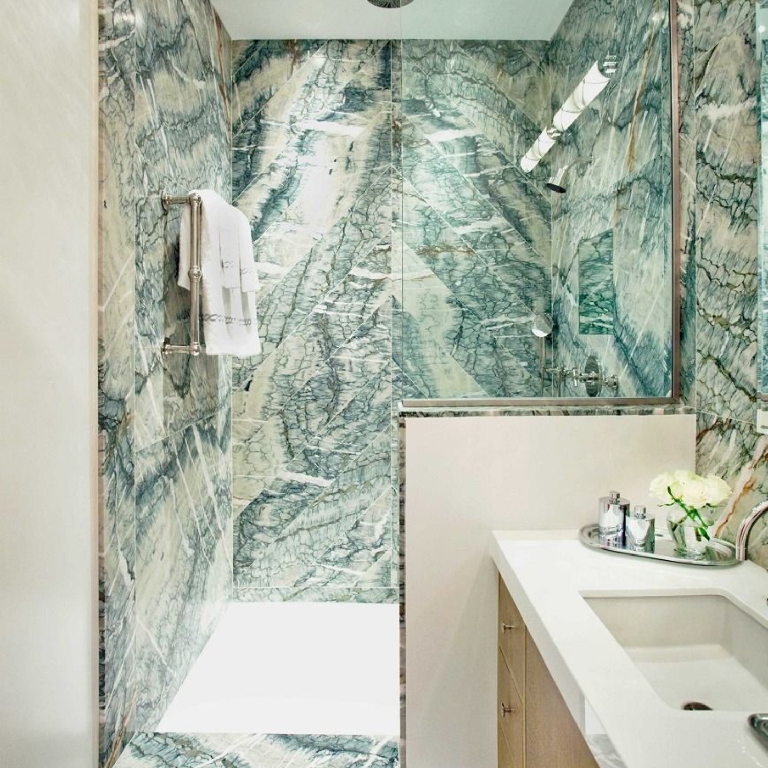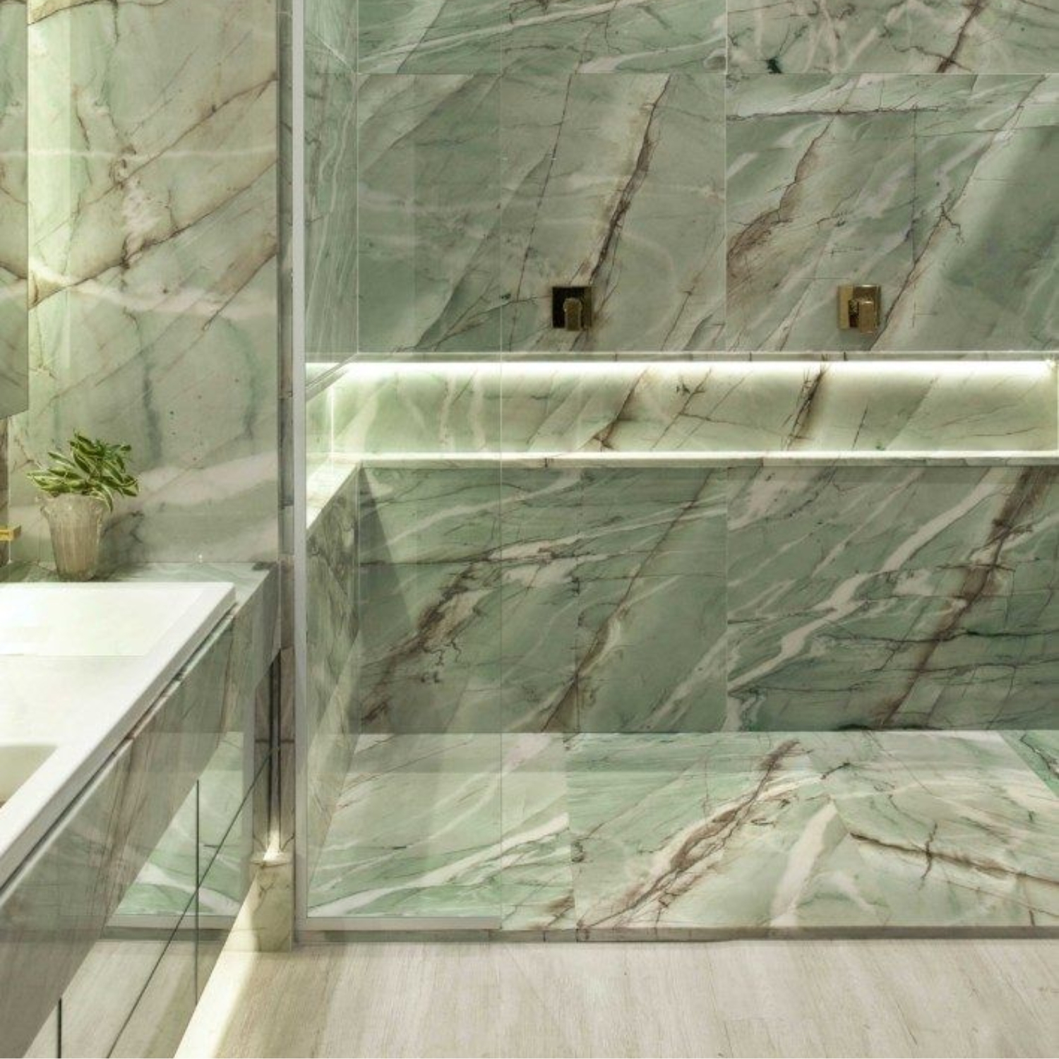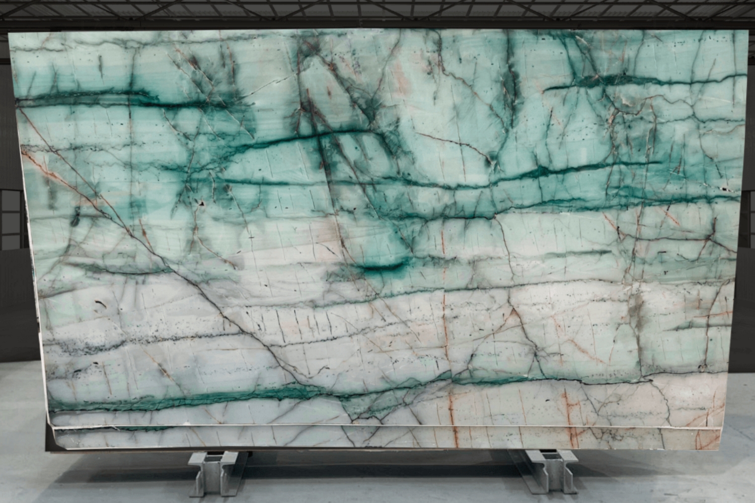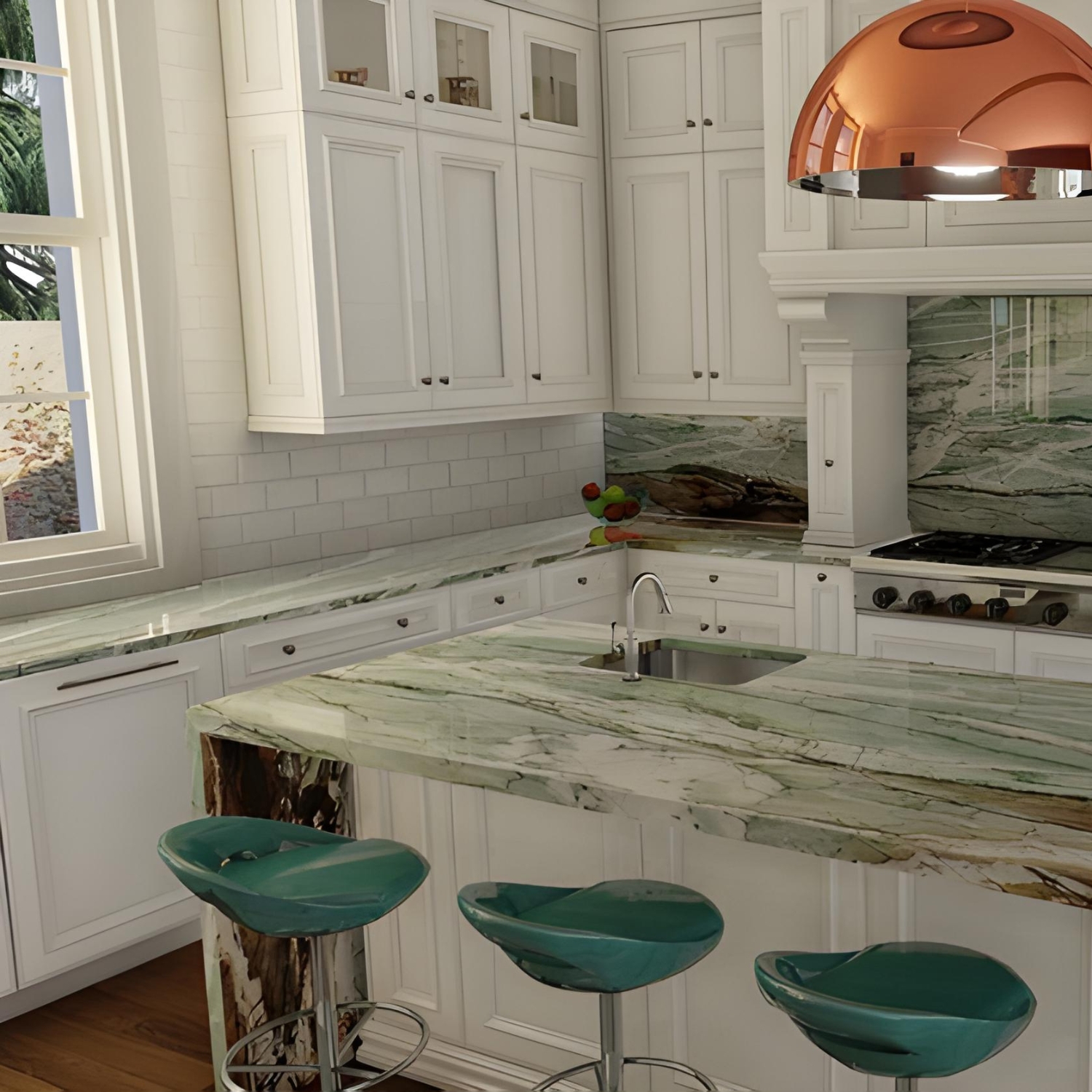 Polished bookmatch marble in striking green with white and orange tones — ideal for high-end benchtops, splashbacks, and feature walls.