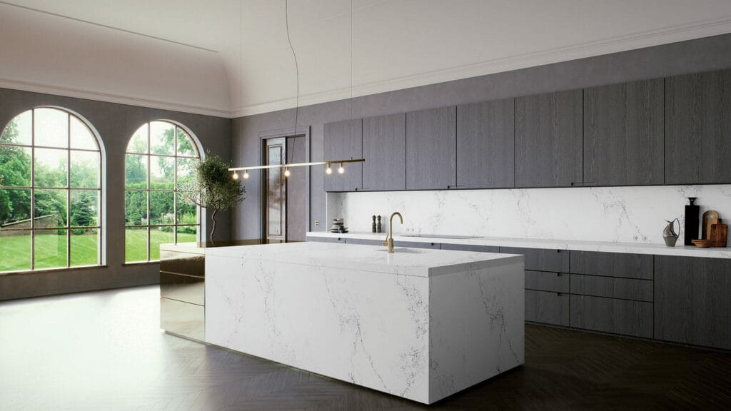 5151 Empira White features a luminous white base accented by bold, flowing grey veining, emulating the elegance of natural Calacatta marble. This silica-free mineral surface offers timeless sophistication, ideal for both classic and contemporary interiors.