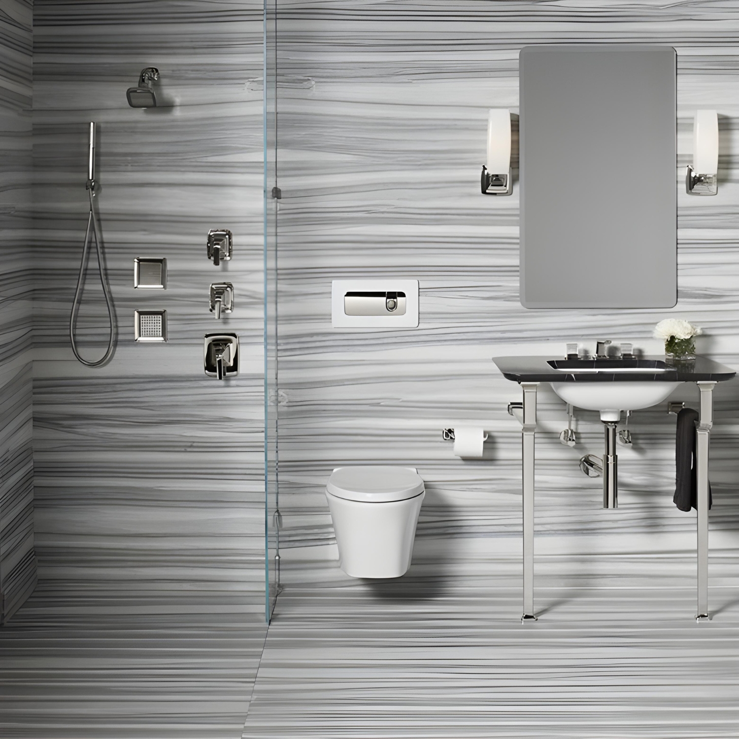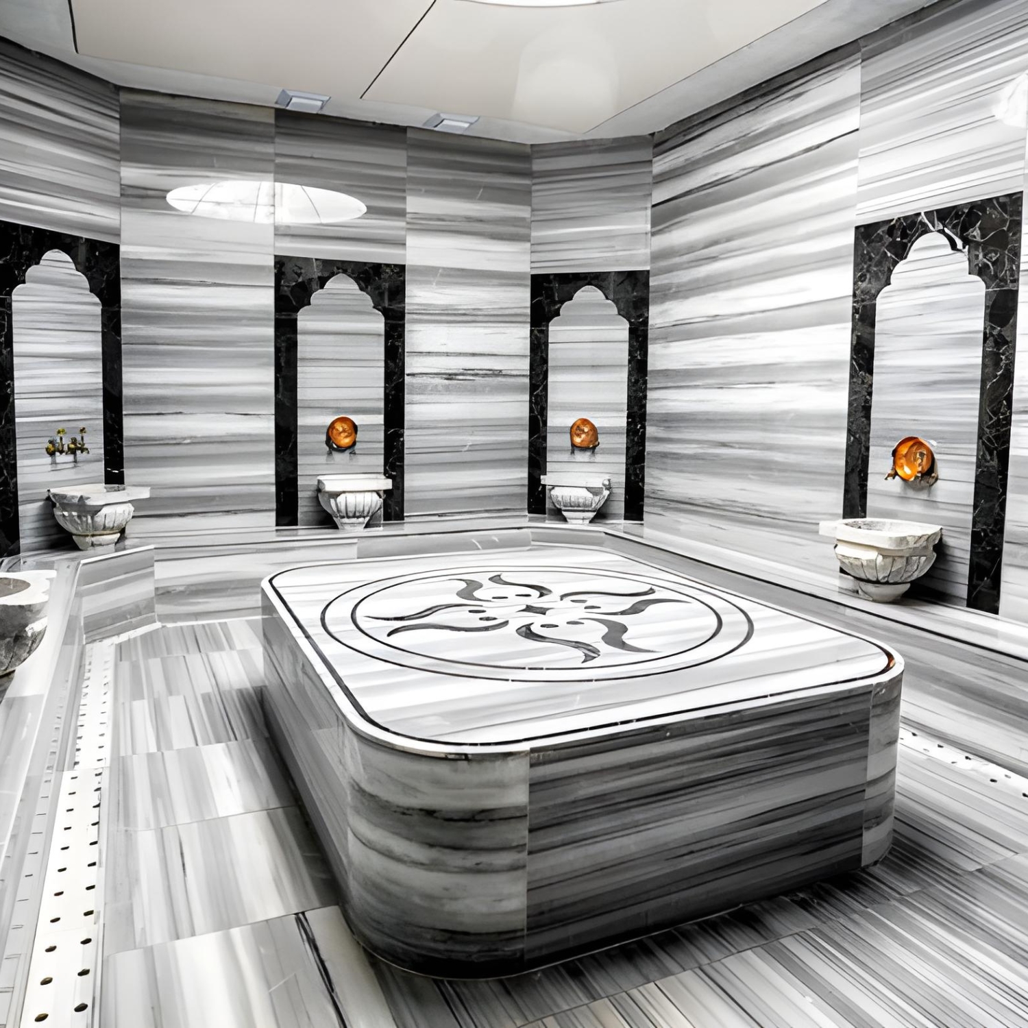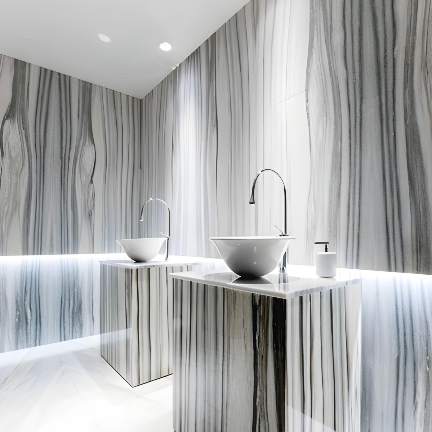 Polished Bookmatched Stone with bold black and white veining—ideal for kitchens, bathrooms, and feature walls.