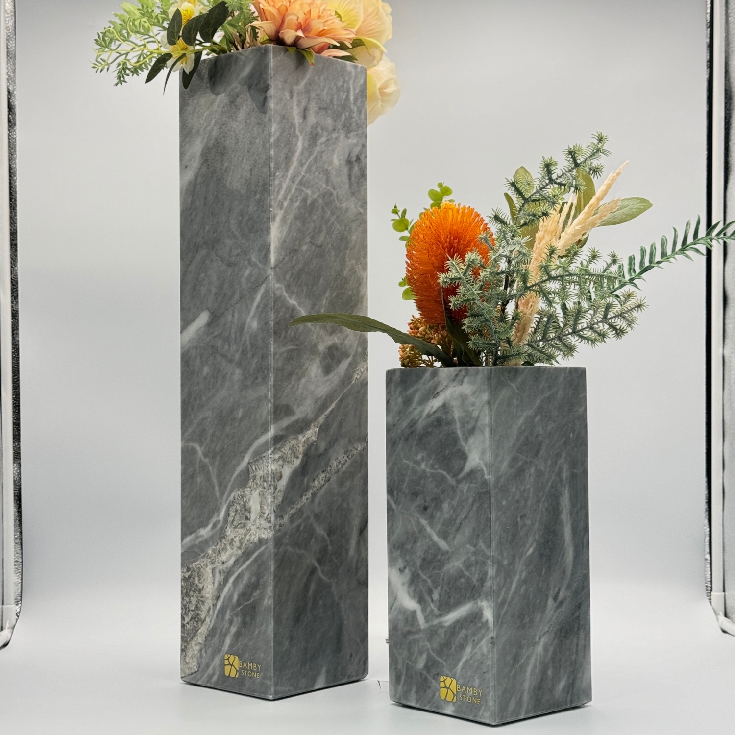Introducing the Fire Grey Marble Vase Set, an exquisite pair crafted from the stunning Fire Grey (Apatite) marble. These vases feature a captivating blend of grey and blue hues, adorned with intricate white and gold-like veining, adding a touch of elegance and luxury to any space.