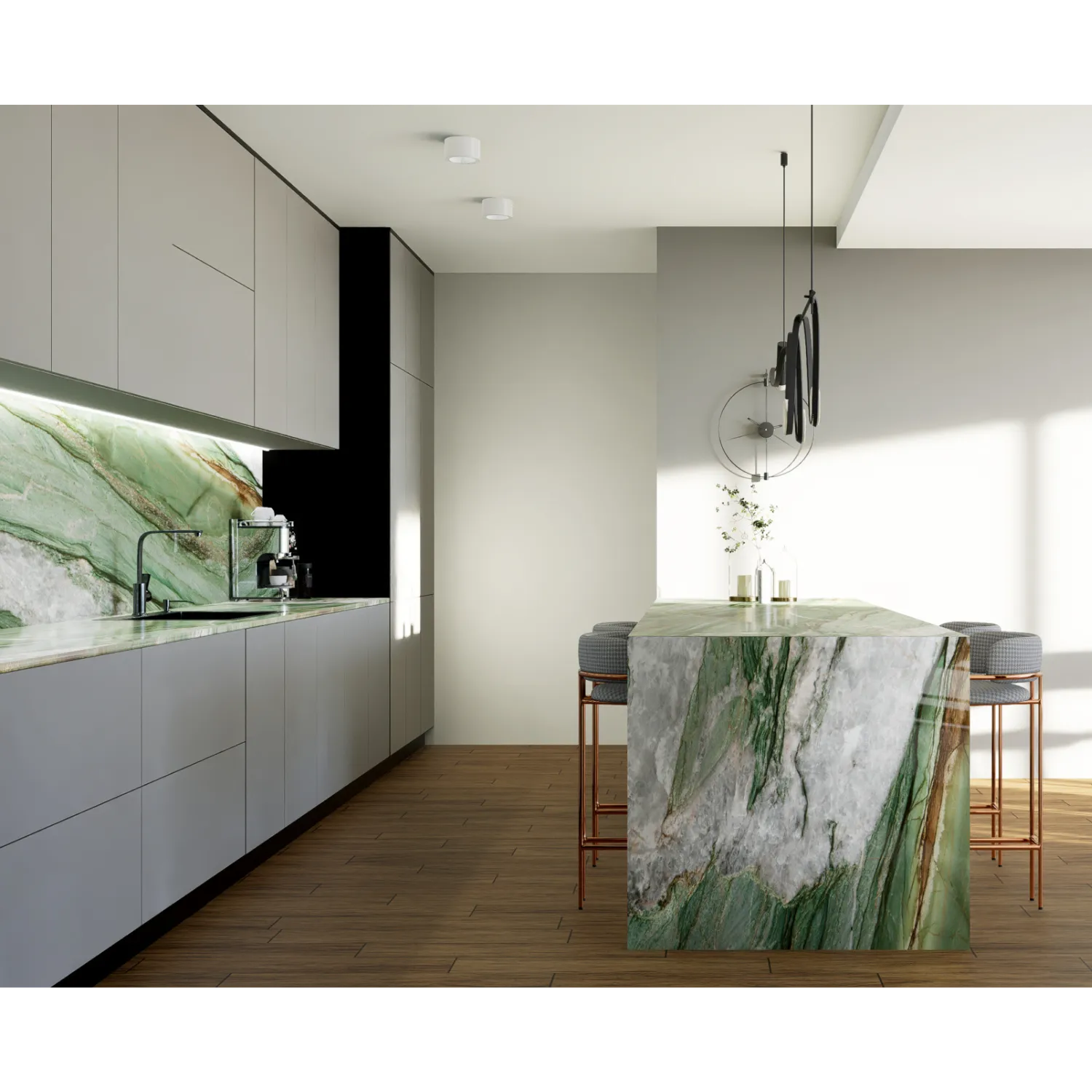 Polished Quartzite with a vibrant green base and striking white veining, ideal for kitchen benchtops and bold statement interiors.