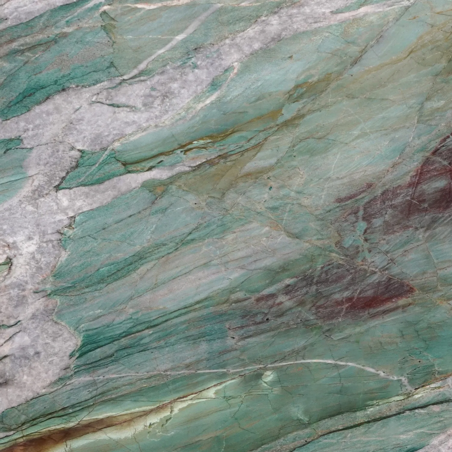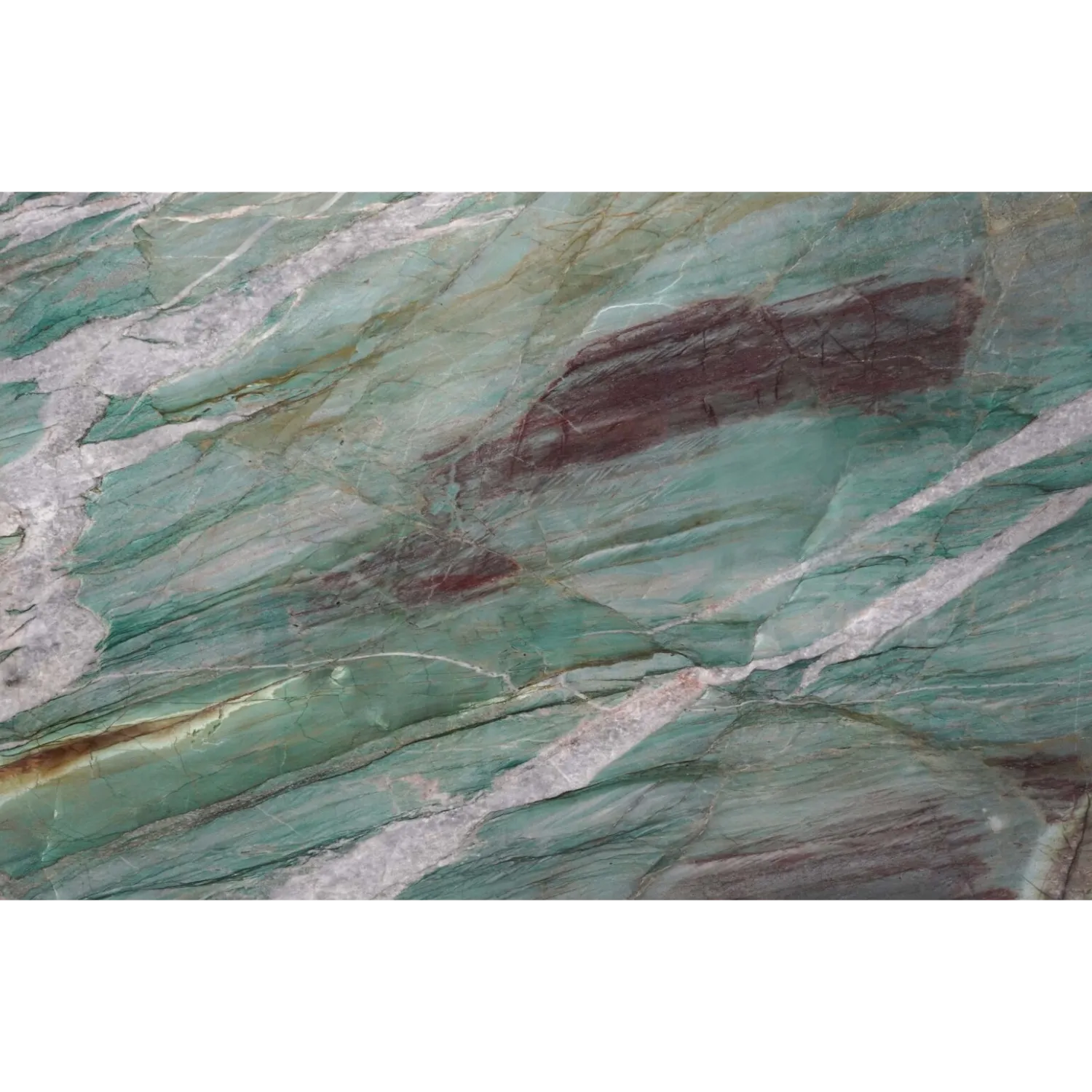 Fuchsite Crystal Quartzite is a vibrant and luxurious natural stone that features a bold green base interwoven with striking white veining and subtle accents of grey and brown. Its vivid colour palette and intricate natural patterns make it a show stopping choice for spaces that demand visual impact and timeless style. The polished finish enhances its depth and clarity, delivering a glossy surface that elevates the vibrancy of the stone.