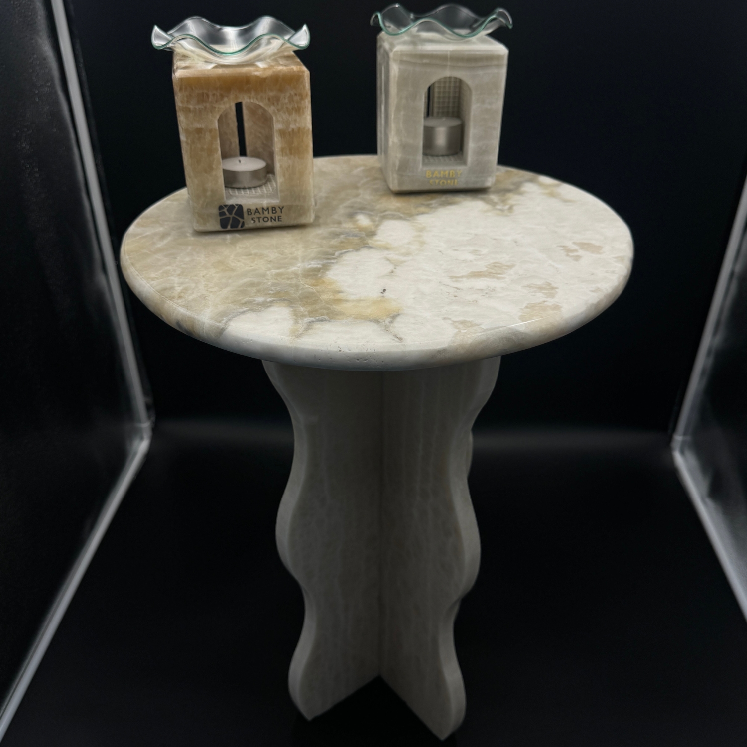 The Honey Onyx (Pietersite) marble, known for its mesmerizing patterns and rich colors, serves as a beacon of clarity and inner strength. It frees you from the entrapments of the mind, assisting in accessing spiritual awakening and deeper insights. The polished surface and intricate veining of this marble side table bring a touch of elegance and sophistication to any room.