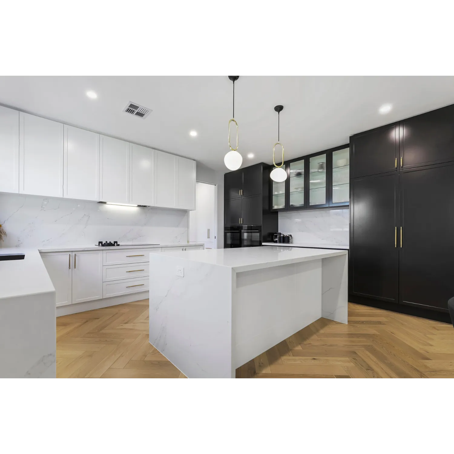 9977 Ice Drift features a cool white base with pale grey Calacatta-style veining and warm-toned drift lines — polished and ideal for modern benchtops and feature spaces.