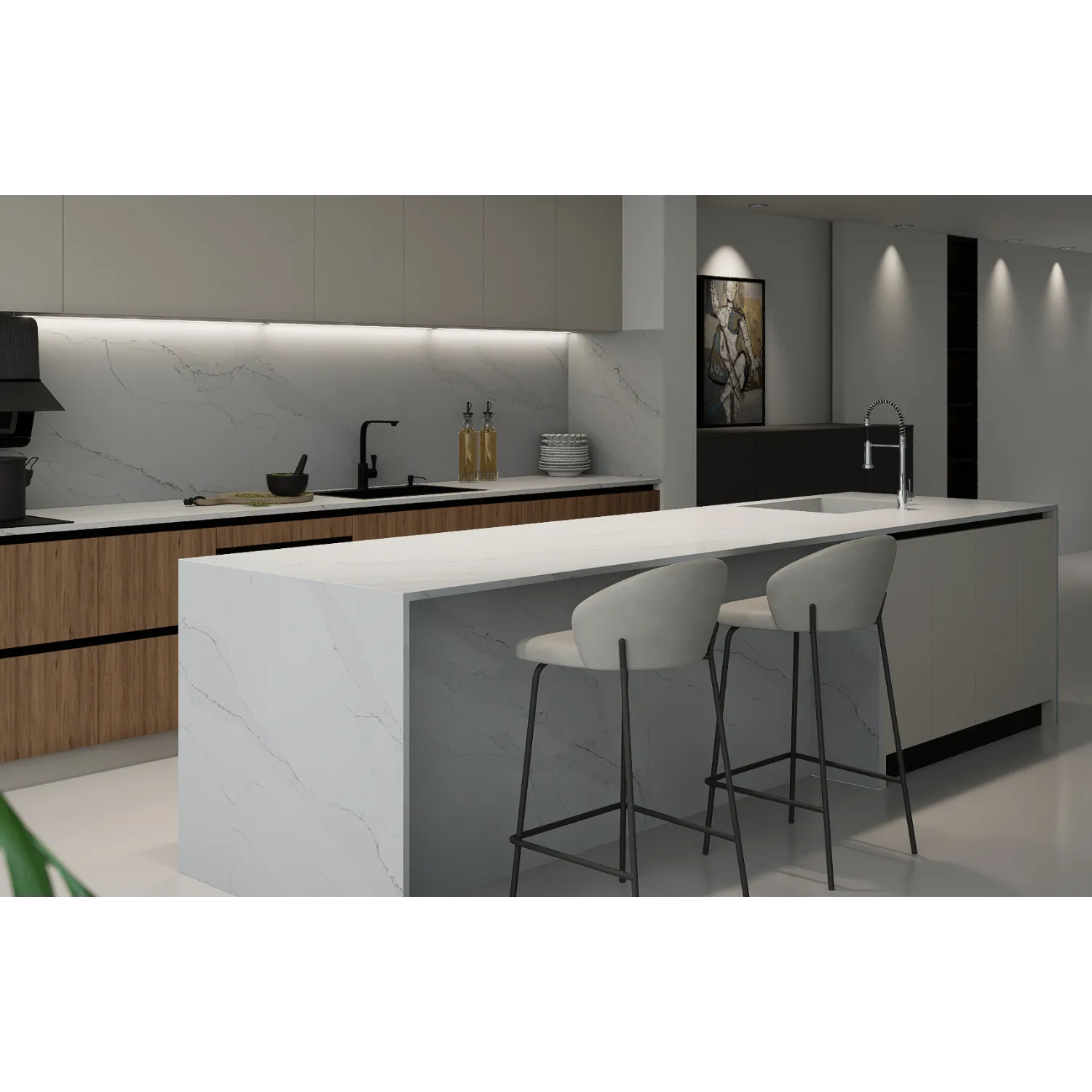 9977 Ice Drift is a sophisticated crystalline silica-free mineral surface, exclusively available at Bamby Stone. Its cool white base is elegantly enhanced with ultra-soft pale grey Calacatta-style veining, subtly layered with fine warm-toned accents that drift fluidly across the surface. This graceful composition captures the harmony of modern luxury and timeless stone appeal.