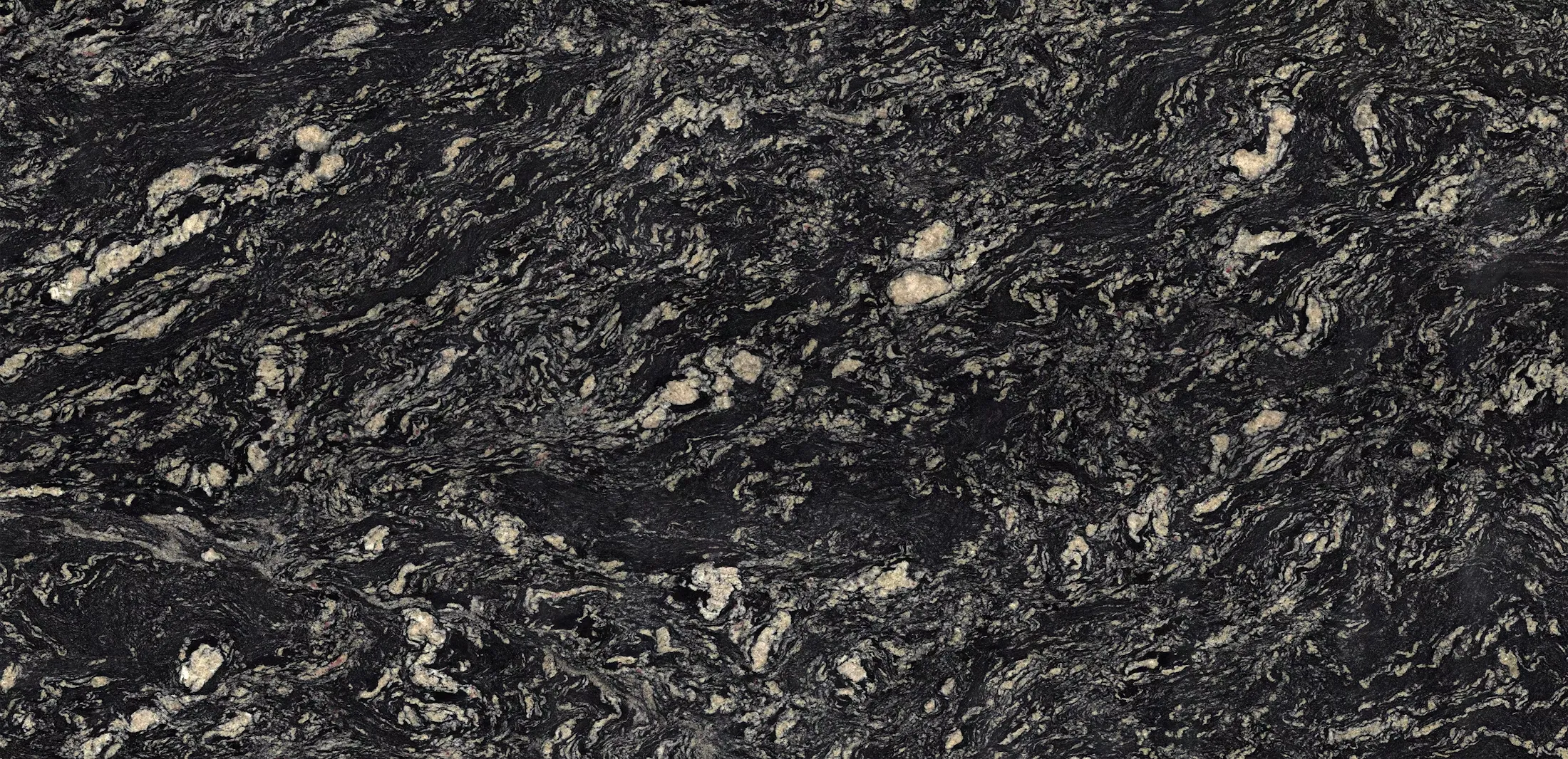 Honed Granite with a black base, ivory-gold veining, and crystal accents, ideal for kitchen benchtops and luxurious interior spaces.