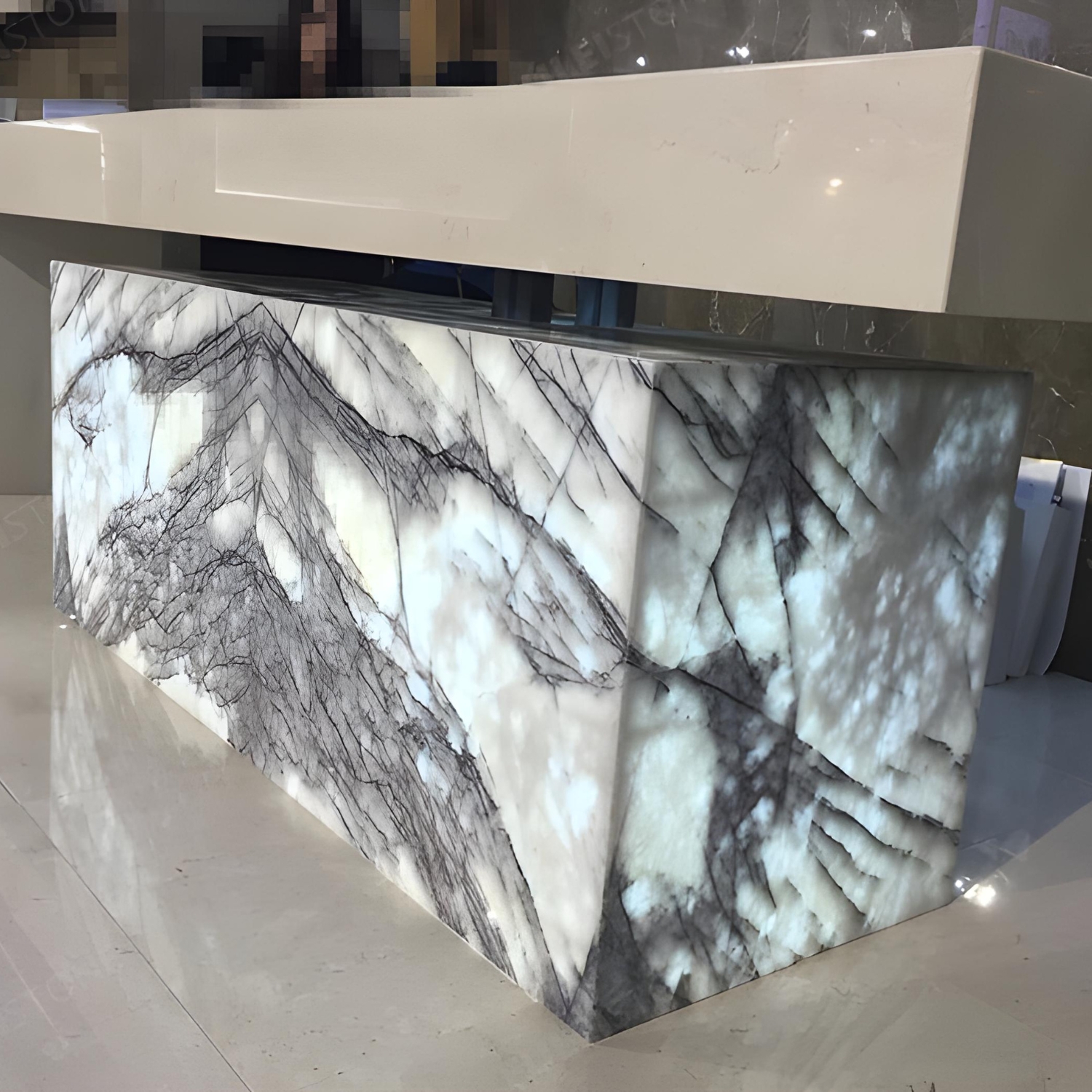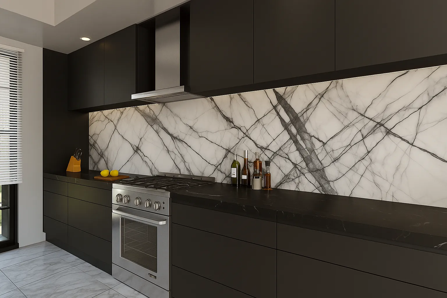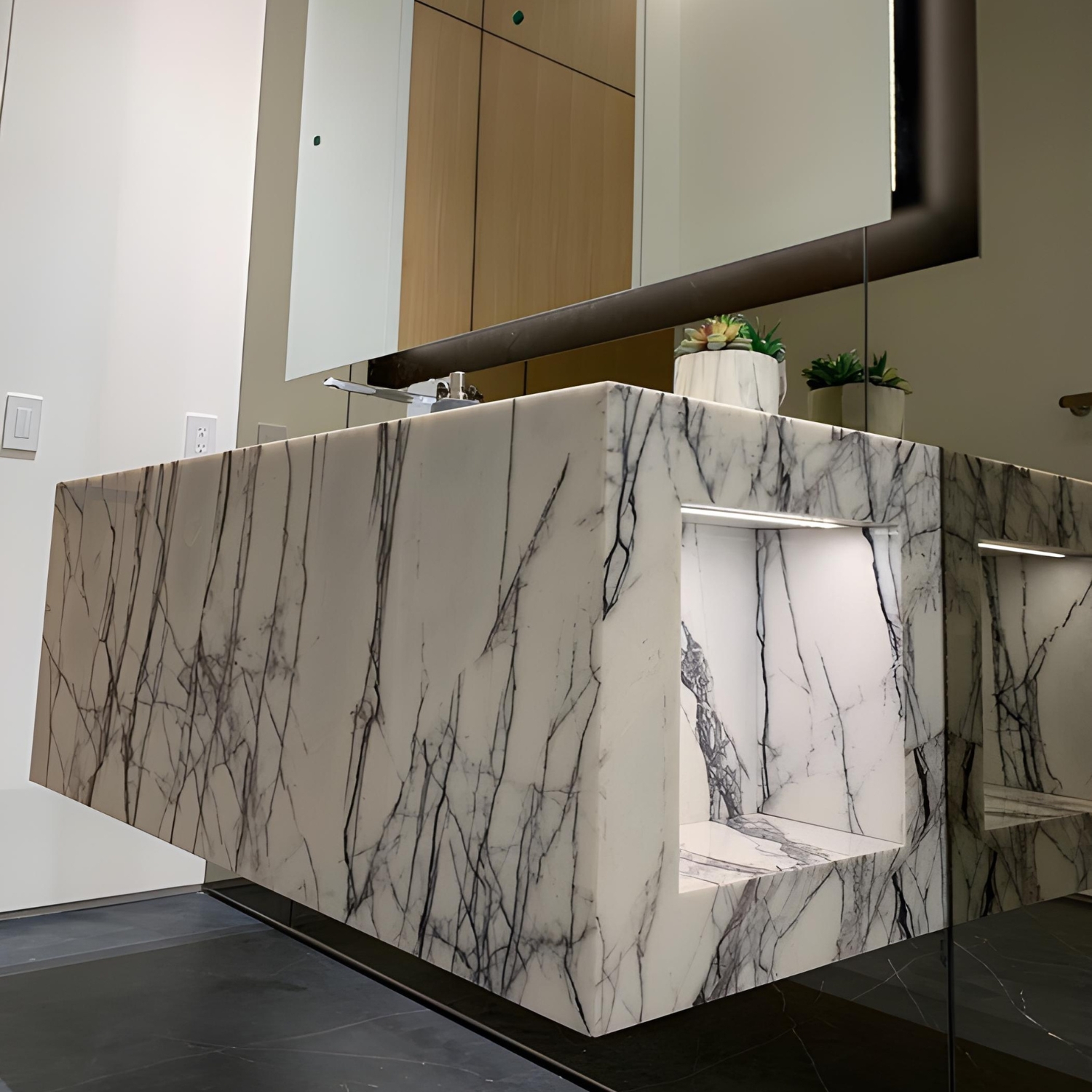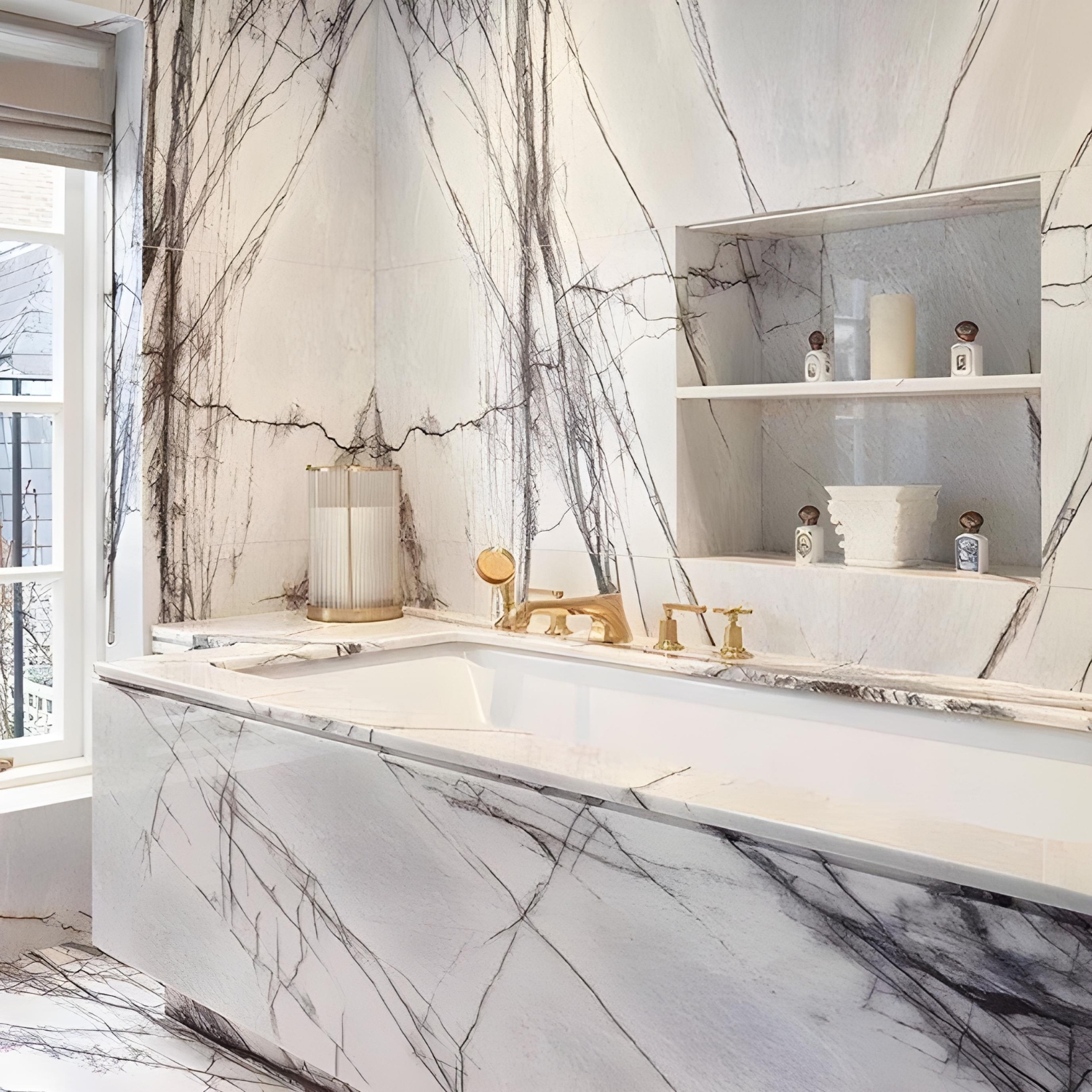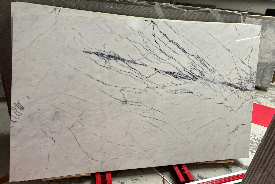 Polished marble from Turkiye in white, black, and grey tones with lilac veining, ideal for feature walls, benchtops, splashbacks, wall cladding, and flooring.