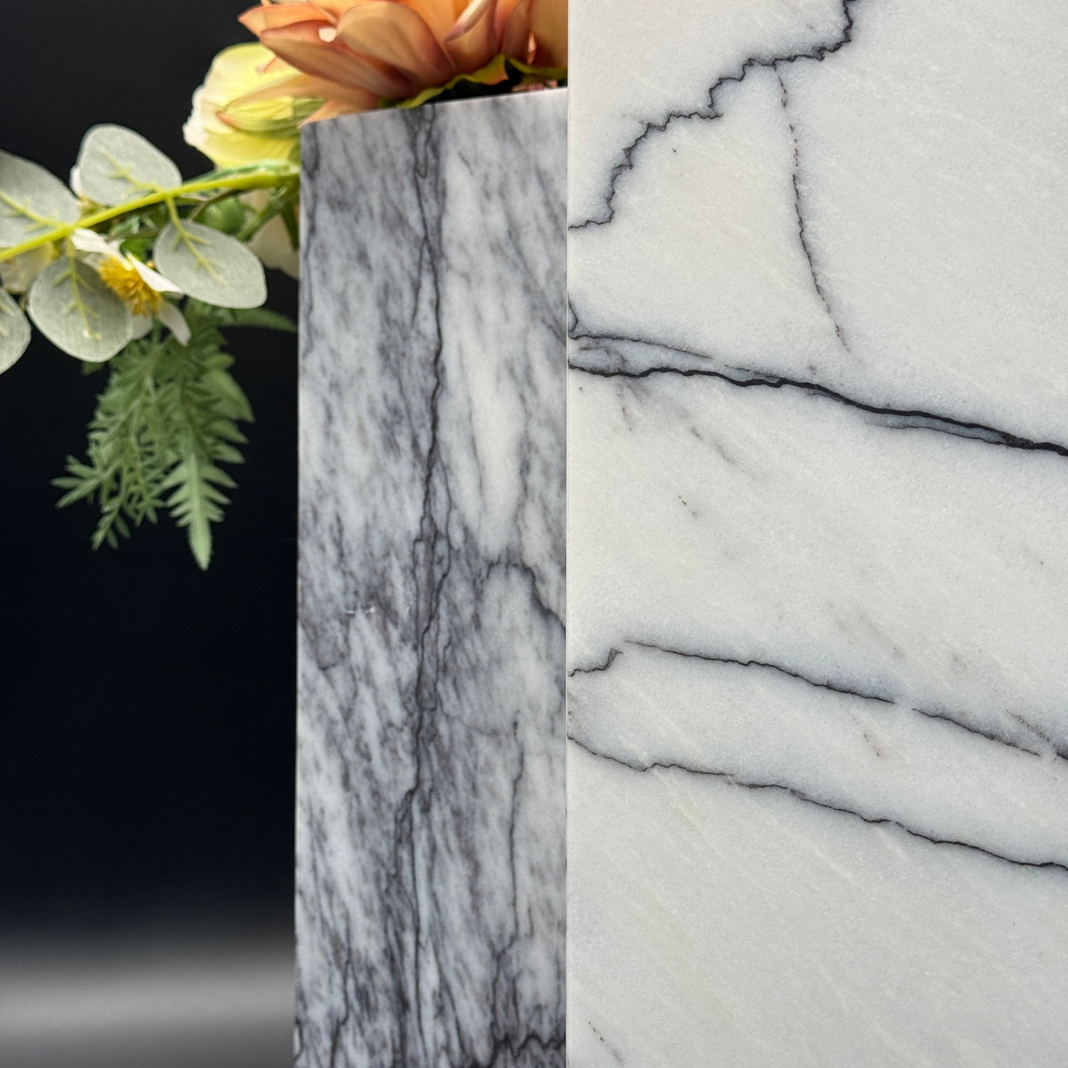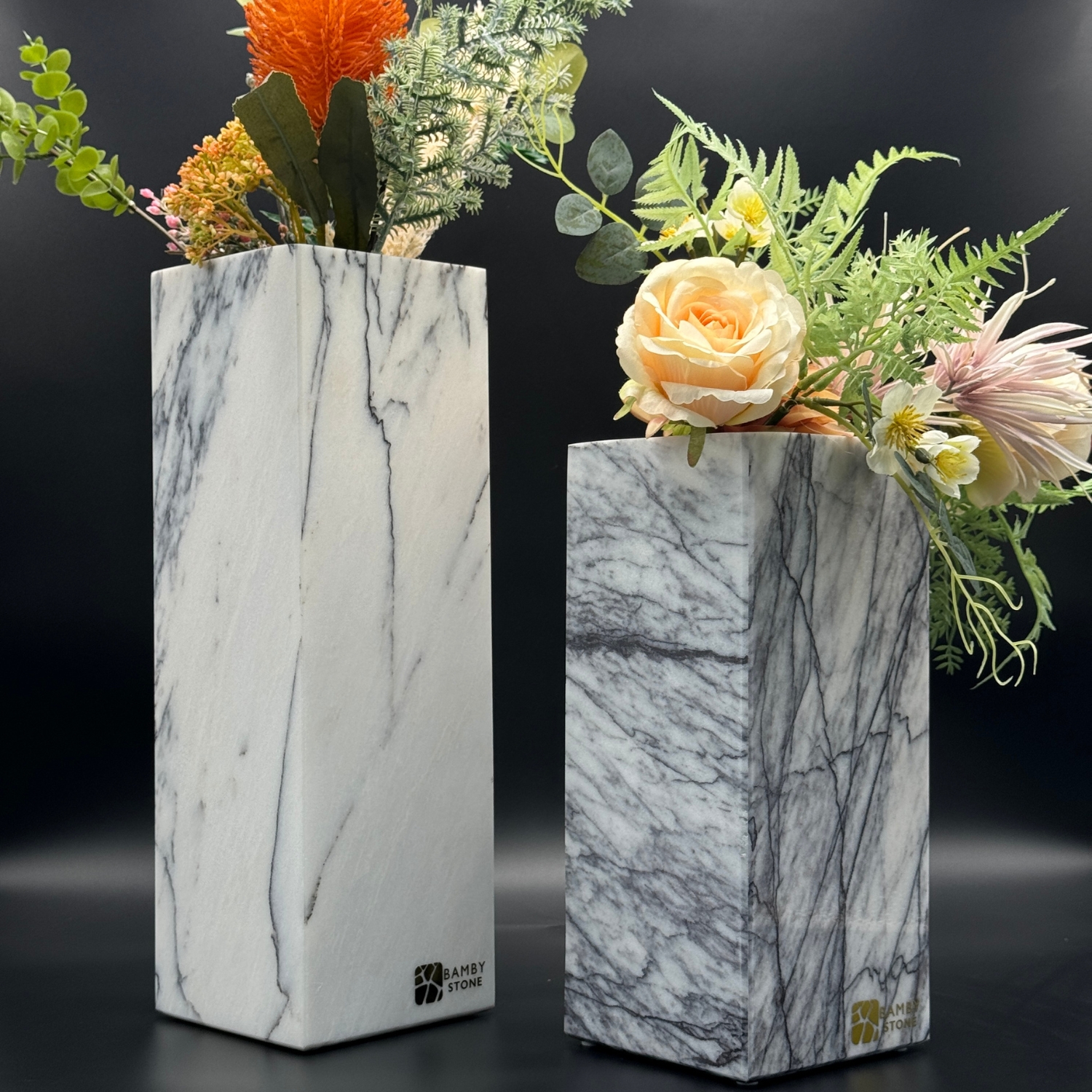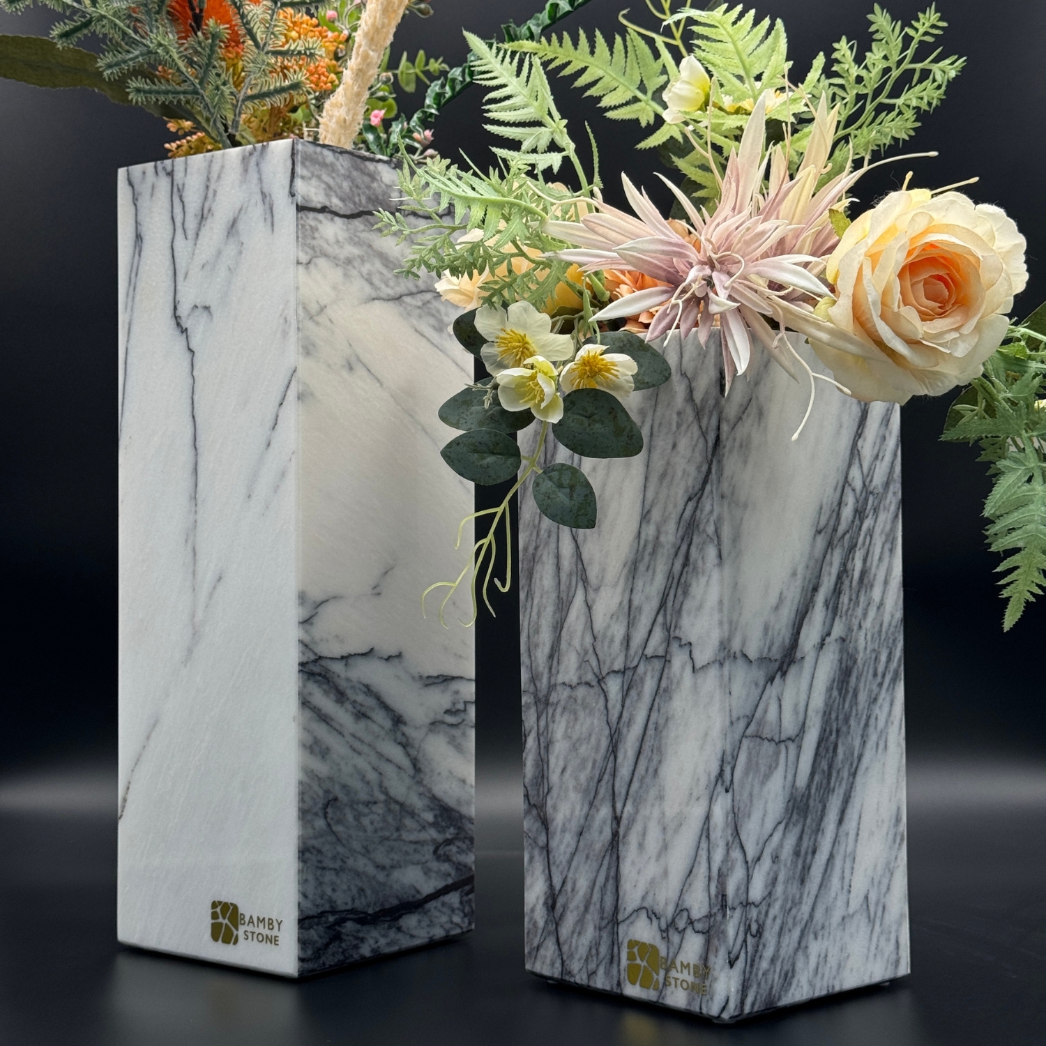 Each vase in this set is meticulously handcrafted, ensuring that no two pieces are exactly alike. The natural veining patterns and colour variations make each vase a unique work of art, perfect for showcasing your favourite floral arrangements or standing alone as a striking piece of home décor. The sleek, modern design complements both contemporary and traditional interiors, making it a versatile addition to any home.