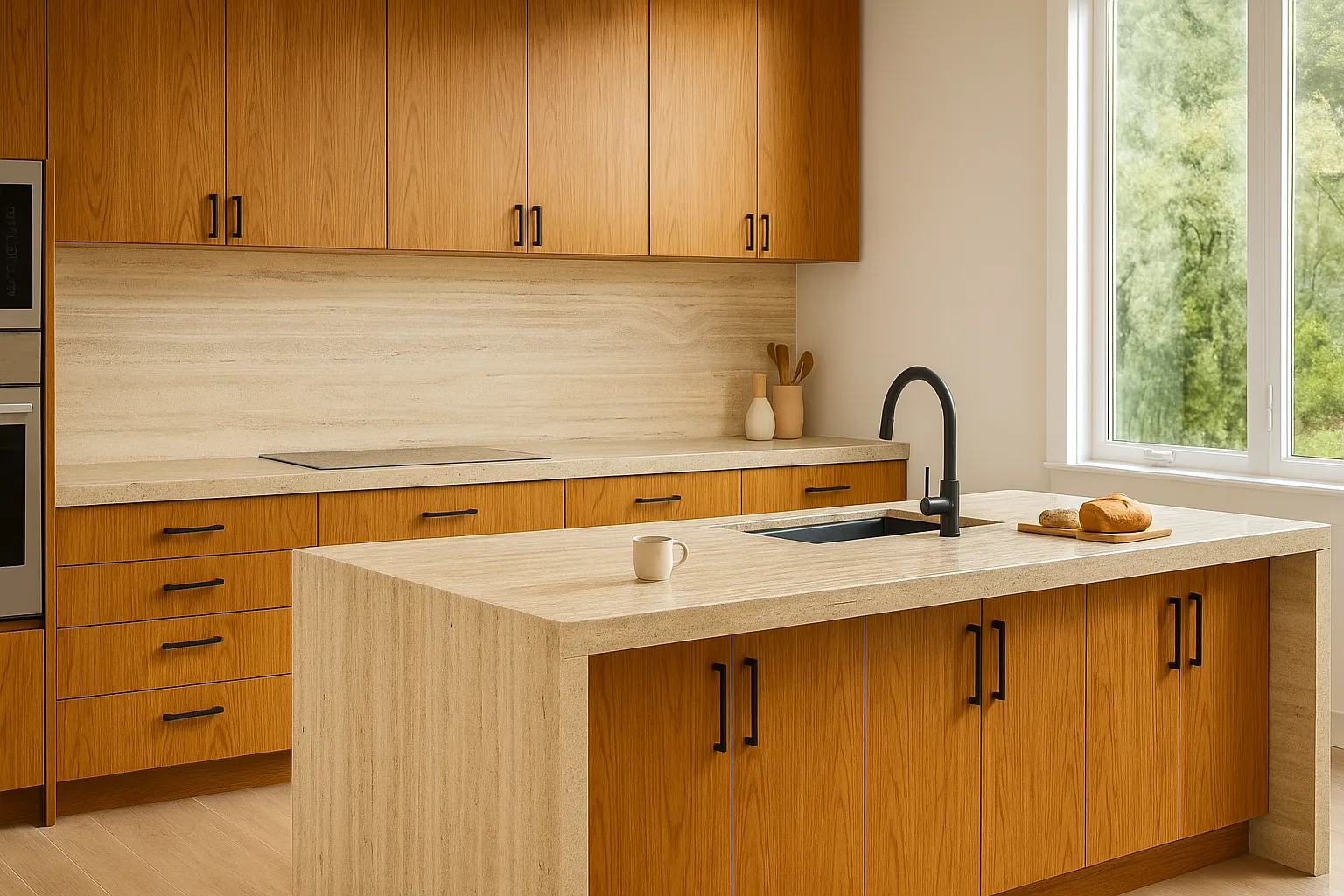 Marmorio Dekton is a light-striped sintered stone from Spain, inspired by Travertino Navona for bright and elegant spaces. Perfect for benchtops, floors, walls, and outdoor use.