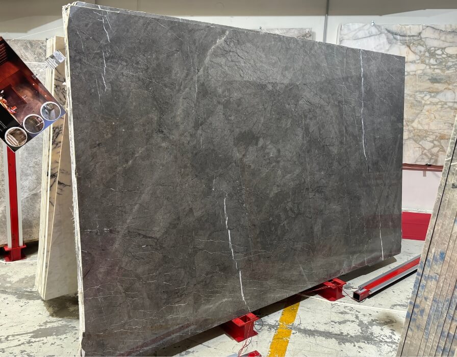 Polished marble from Australia in brown-grey tones with dark veining and white accents — ideal for benchtops, splashbacks, vanities, cladding, floors, and fireplaces.