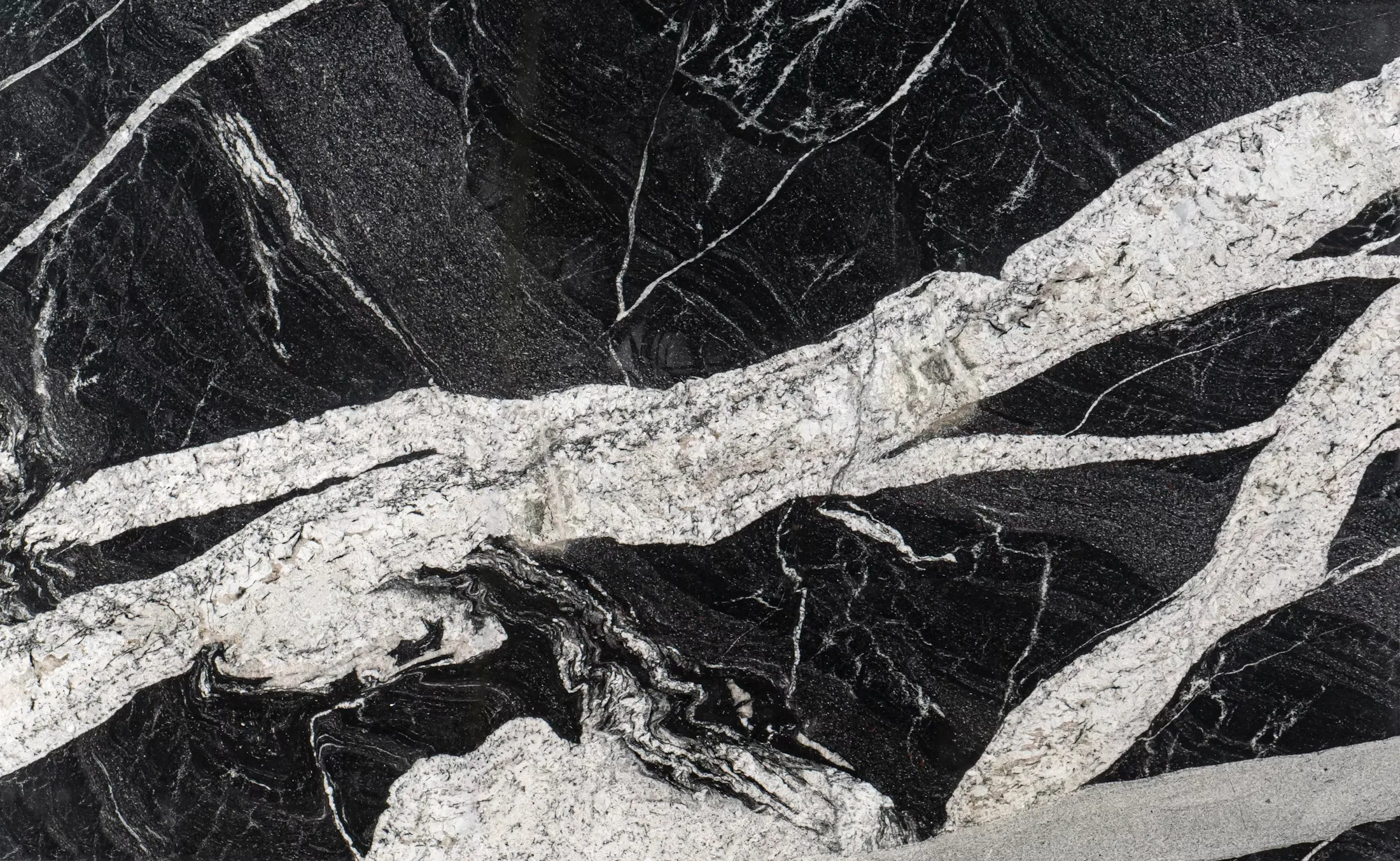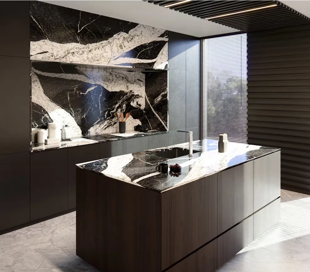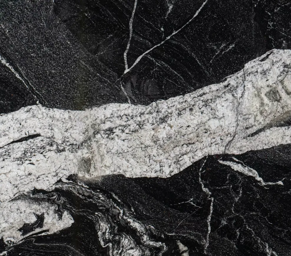 Polished Granite with a black base and wide white-grey veining, ideal for kitchen benchtops and bold, high-contrast interiors.