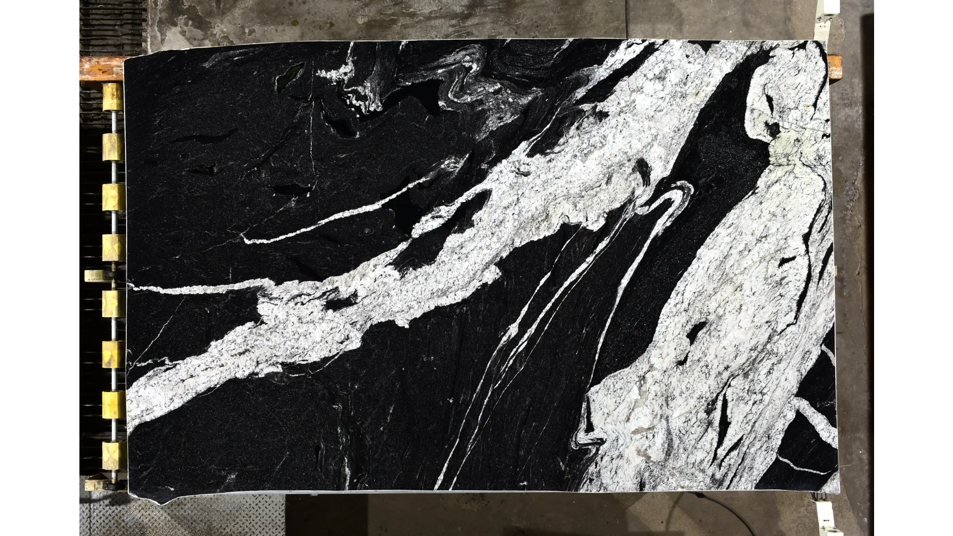 Naori Granite is a bold and captivating natural stone from Brazil, showcasing a deep black base punctuated by striking wide white and light grey veining. This dramatic contrast creates a dynamic, high-impact surface that adds instant character to any interior. The polished finish enhances the depth of colour and sharpness of the veining, delivering a brilliant, high-gloss surface that feels both luxurious and expressive.