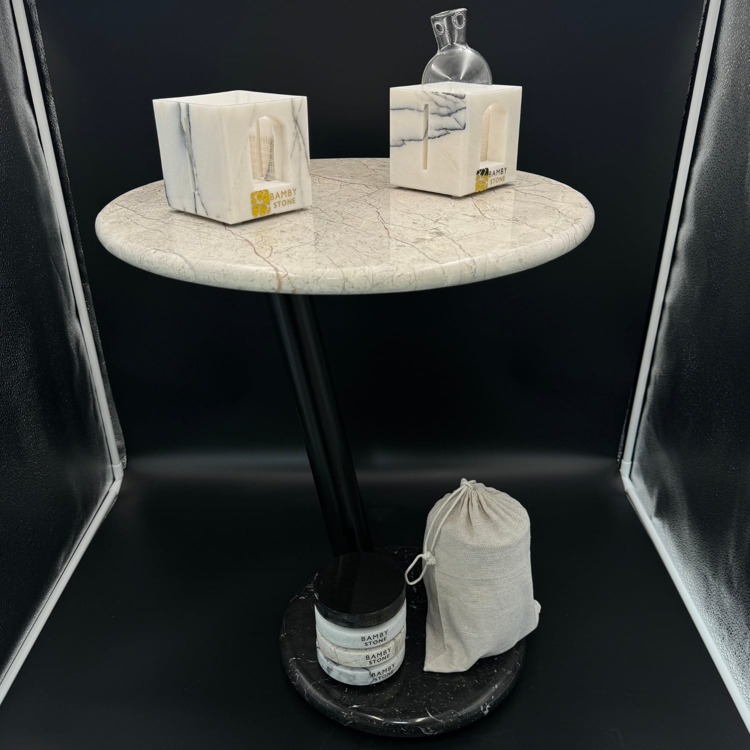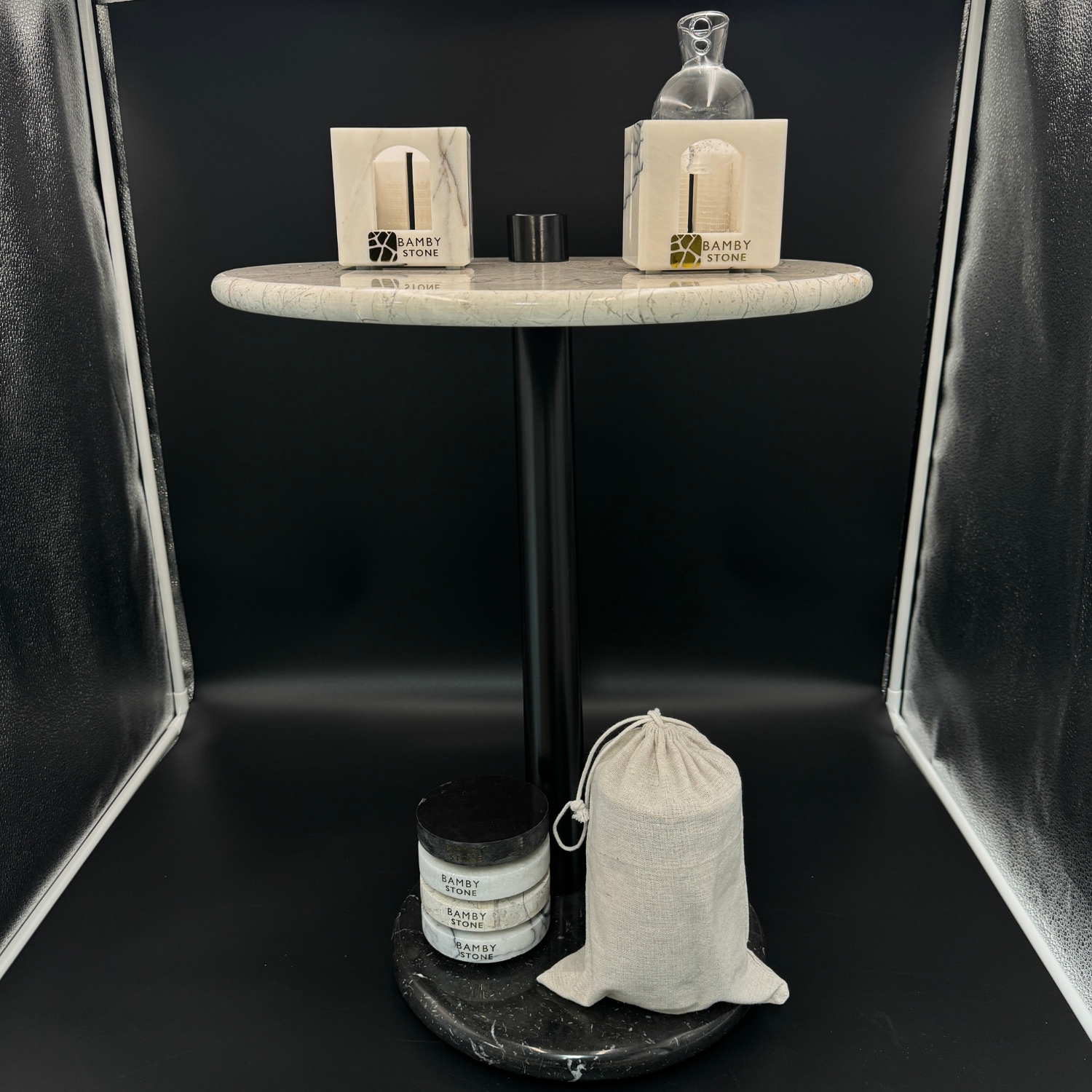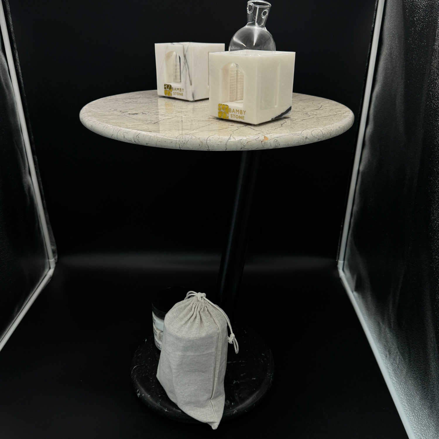 Introducing the River Grey Polished Side Table, a stunning piece crafted from River Grey (Natrolite) marble. This elegant table features a captivating blend of cream and beige tones, accentuated by delicate black dots and intricate veining. The unique coloration and patterns of the marble give each table its own distinctive charm, making it a timeless addition to any room.