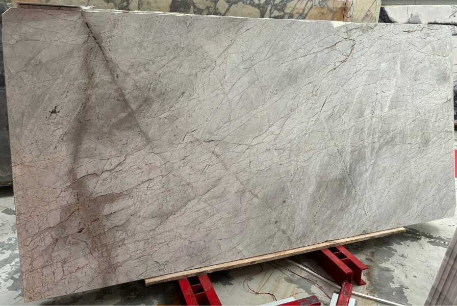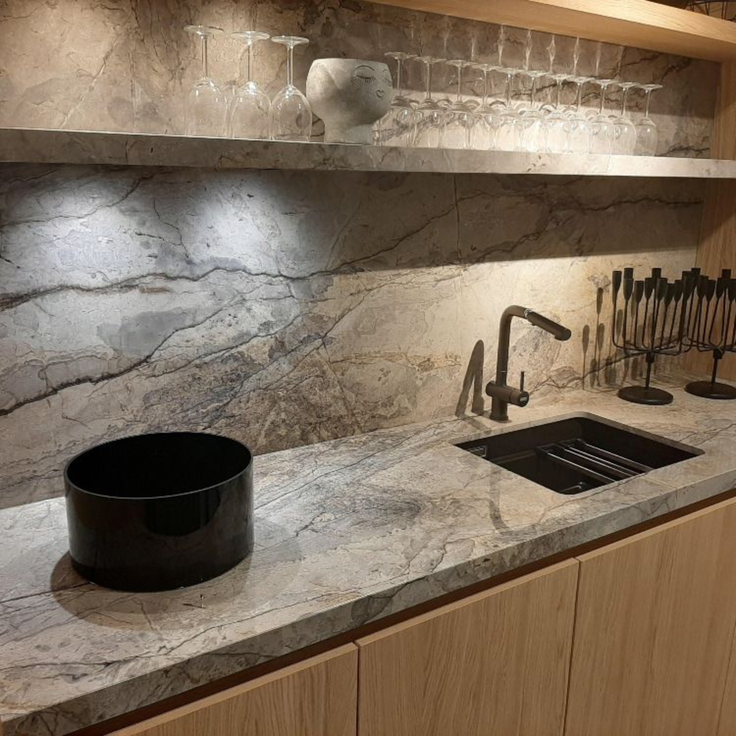 River Grey (Natrolite) is a bookmatched marble from Turkiye, featuring a refined palette of cream and beige tones, accentuated by scattered black dots and veining that resemble the soft, flowing movement of a riverbed. Named after the Greek word "natron"—referencing its sodium-rich composition—this stone is believed to raise energetic vibrations and foster a deep sense of awakening and clarity. Ideal for both interior and exterior applications, River Grey delivers timeless sophistication with a metaphysical twist, helping you realign your perspective and discover new purpose in everyday life. Perfect for countertops, floors, wall cladding, staircases, tables, and commercial installations, this elegant surface blends functionality with serene design. Please check availability with our team to confirm current stock and lead times.