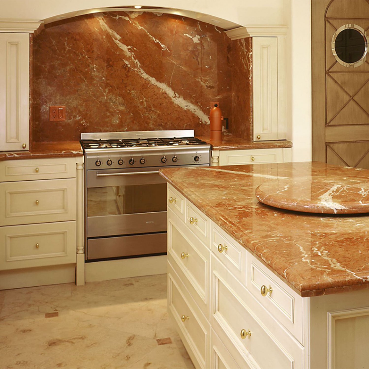 Polished bookmatched marble from Turkiye, featuring pink, white, and cream tones — perfect for feature elements and heartwarming interiors.
