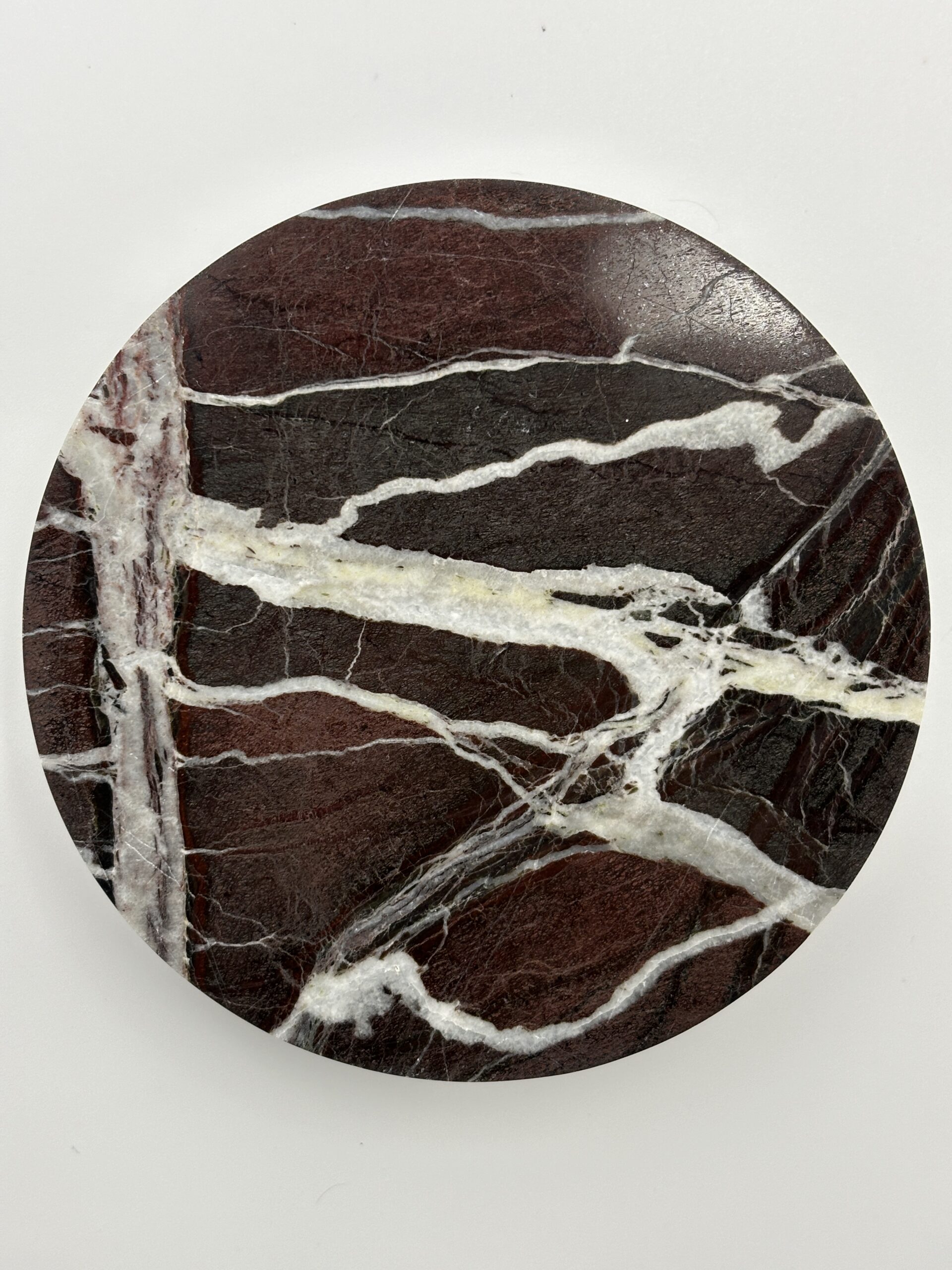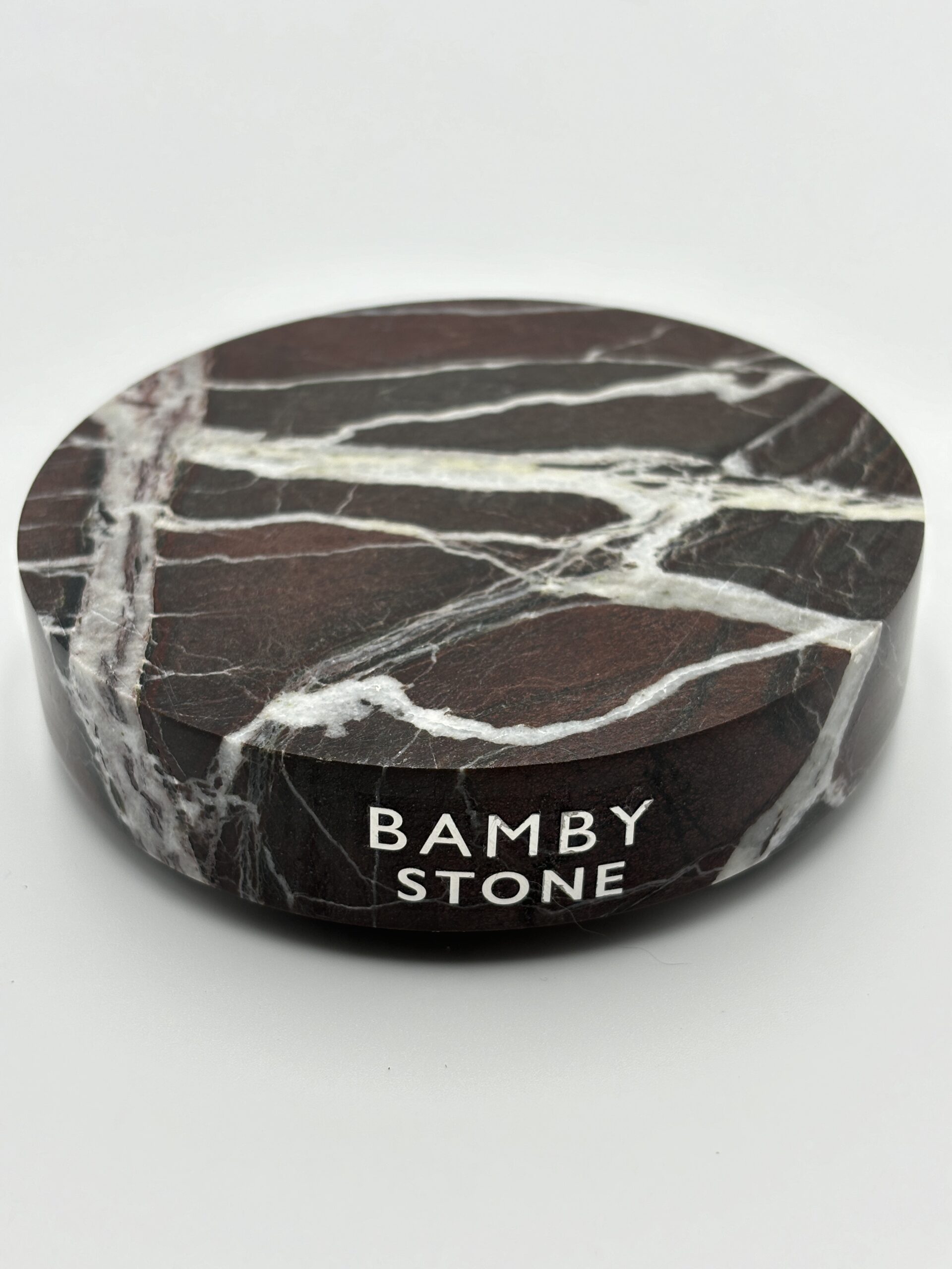 Introducing the Bamby Stone Rosso Levanto Coaster, an exquisite addition to any table setting or decor arrangement. Crafted from the luxurious Rosso Levanto marble, this coaster exhibits a rich, deep burgundy hue accentuated by striking white veining, creating a beautiful contrast that highlights its sophisticated nature. The smooth, polished surface of the coaster exudes elegance, while the underside is fitted with rubber grips to ensure stability and protect delicate surfaces. Perfect for entertaining guests or enjoying a quiet drink, the Bamby Stone Rosso Levanto Coaster combines timeless style with functional durability, making it an exceptional choice for lovers of fine craftsmanship.