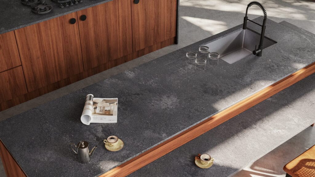 Crafted from a sustainable blend of natural minerals and recycled materials, Rugged Concrete is crystalline silica-free, aligning with contemporary health and safety standards. Ideal for a wide range of indoor applications including kitchen benchtops, bathroom vanities, and feature walls, it combines striking aesthetics with durable, practical performance. Its non-porous composition ensures resistance to stains, scratches, and heat, making it easy to maintain and long-lasting.