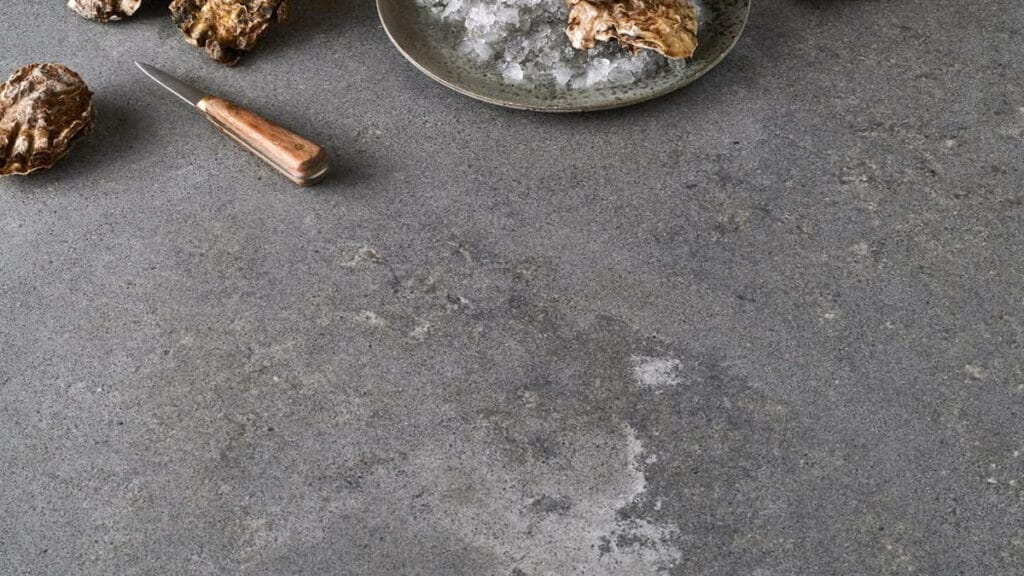 4033 Rugged Concrete is a robust grey engineered mineral surface with authentic industrial texture — silica-free and ideal for benchtops, vanities, and walls.