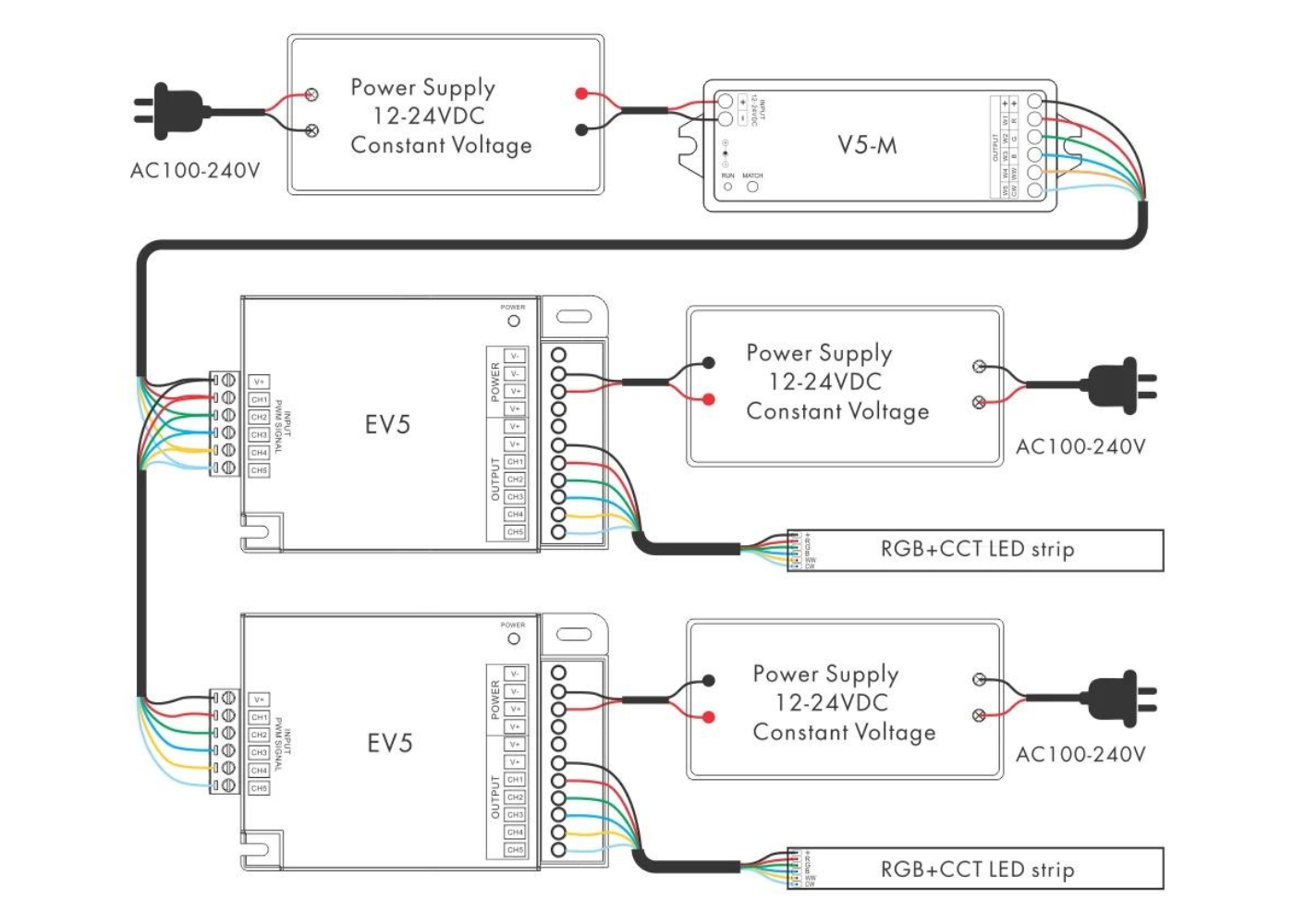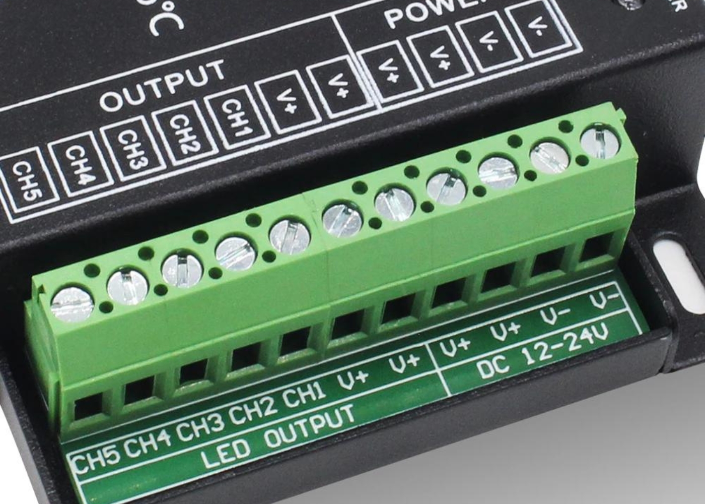 This RGBW, RGBCCT LED strip light repeater/amplifier can expand a controller’s capacity up to 25A. By using an amplifier, all functions of the controller are replicated through to the LED strip connected to the repeater.