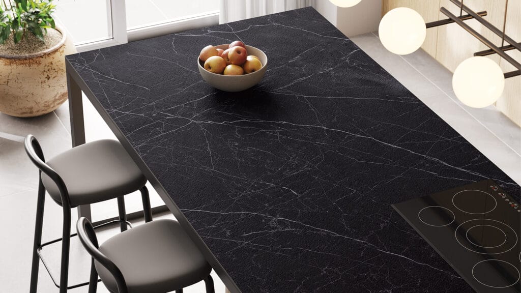511 Smokestone is an ultra rough porcelain surface with a bold black base and lightning-white veining—ideal for benchtops, splashbacks, vanities, and statement walls.