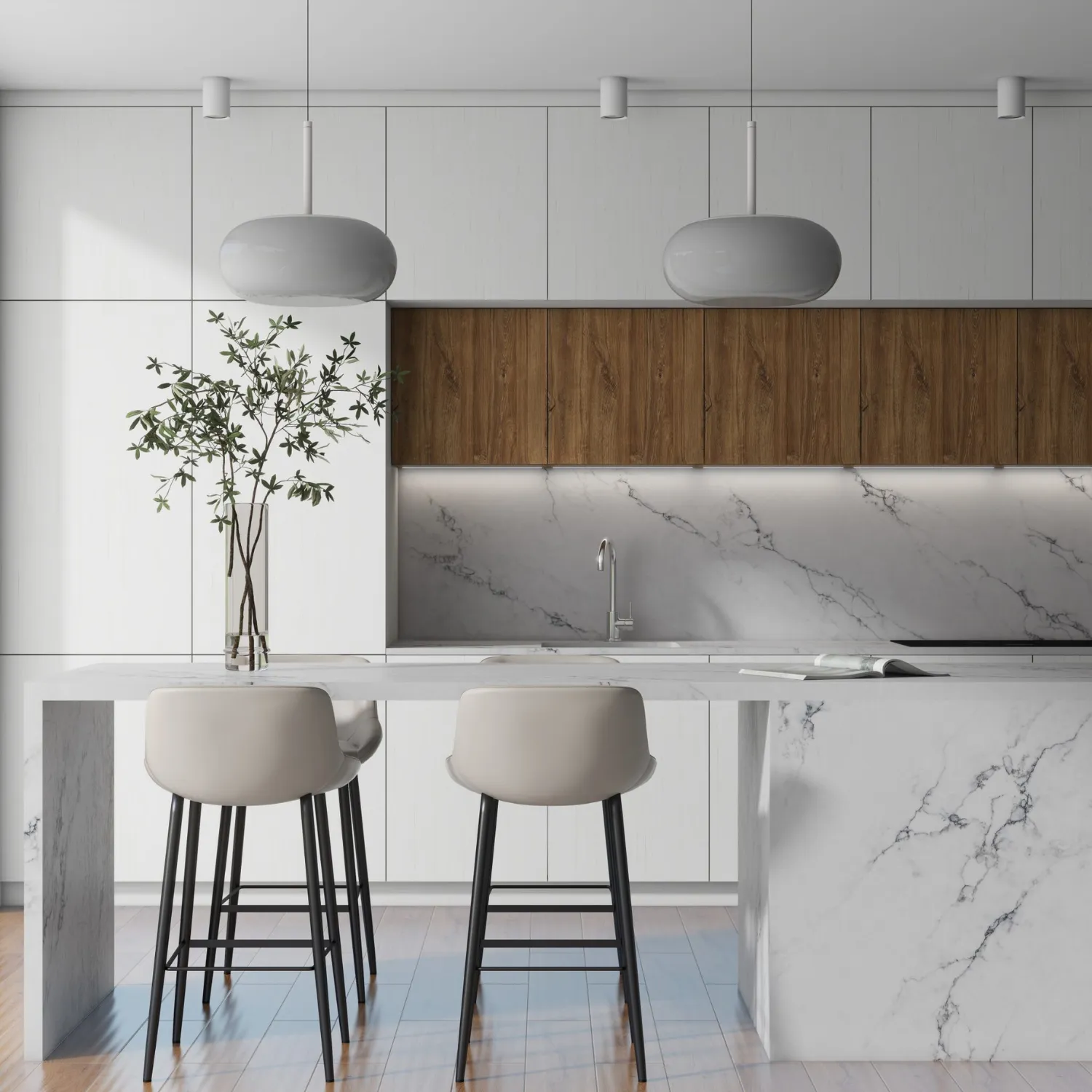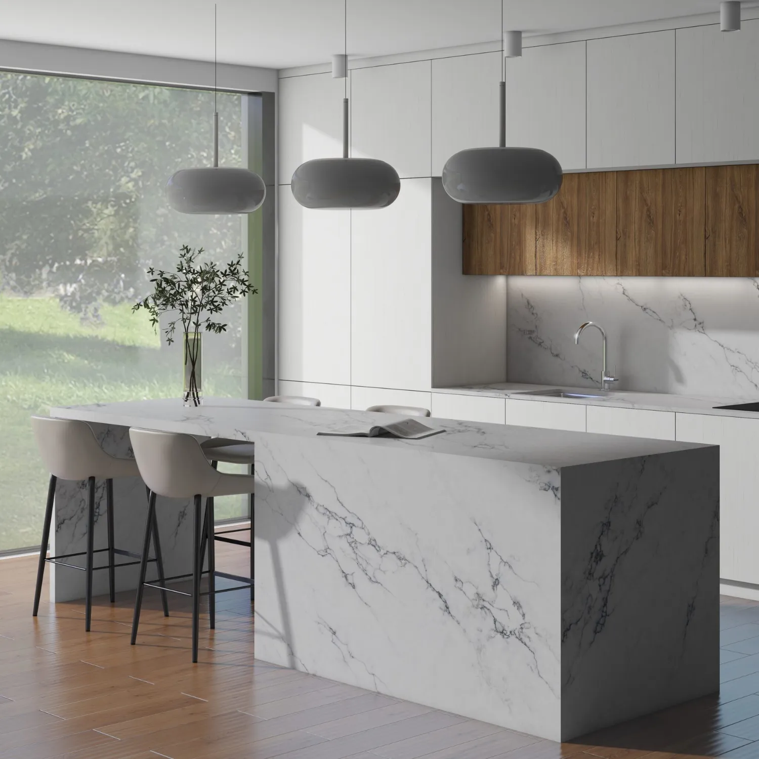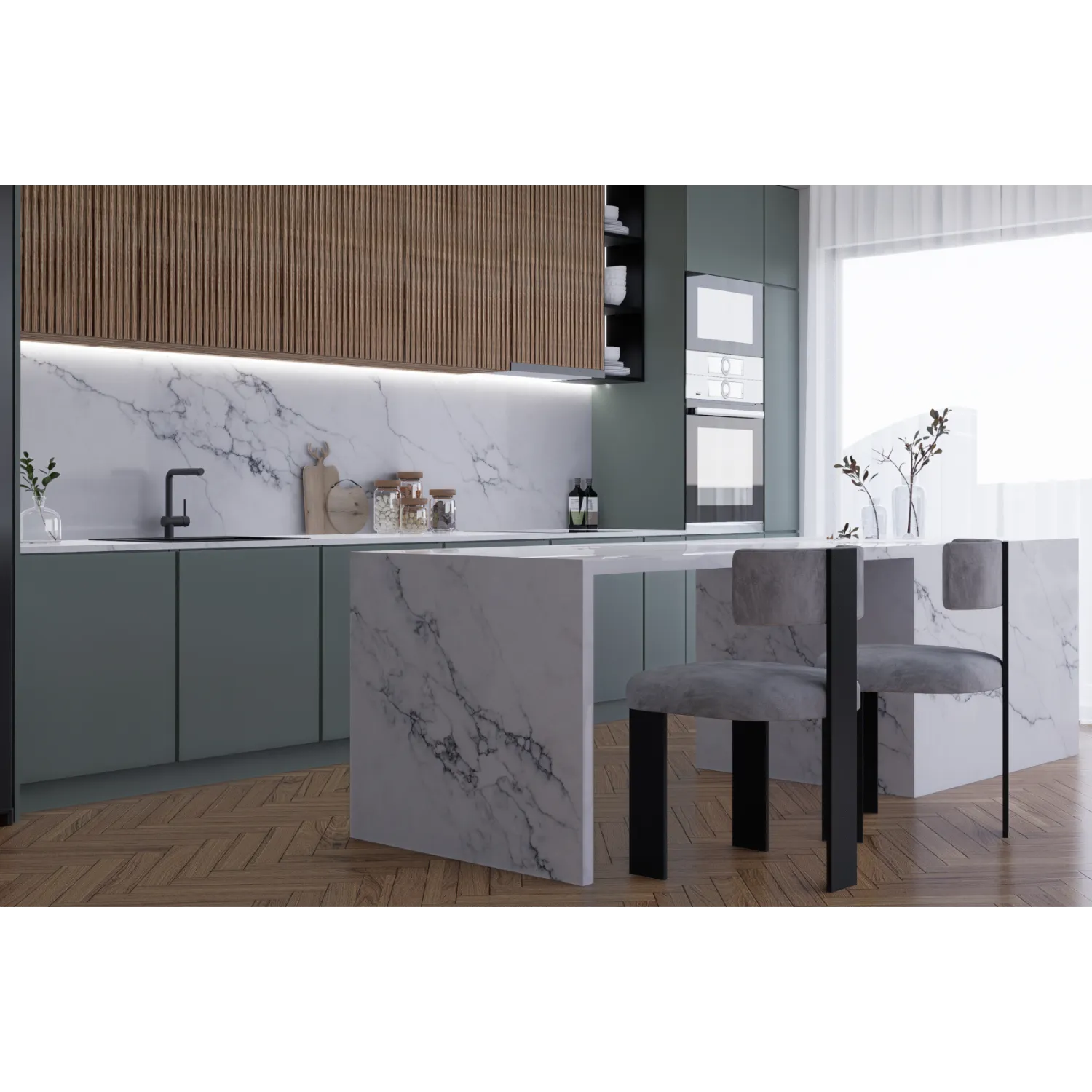 Engineered from a sustainable mix of natural minerals and recycled content, this surface is free from crystalline silica, aligning with modern safety standards. The polished finish adds a radiant clarity, brightening rooms and amplifying the delicate veining detail. Whether used for kitchen benchtops, bathroom vanities, or decorative walls, Statuario Enzo delivers visual refinement with durable, easy-to-maintain functionality.