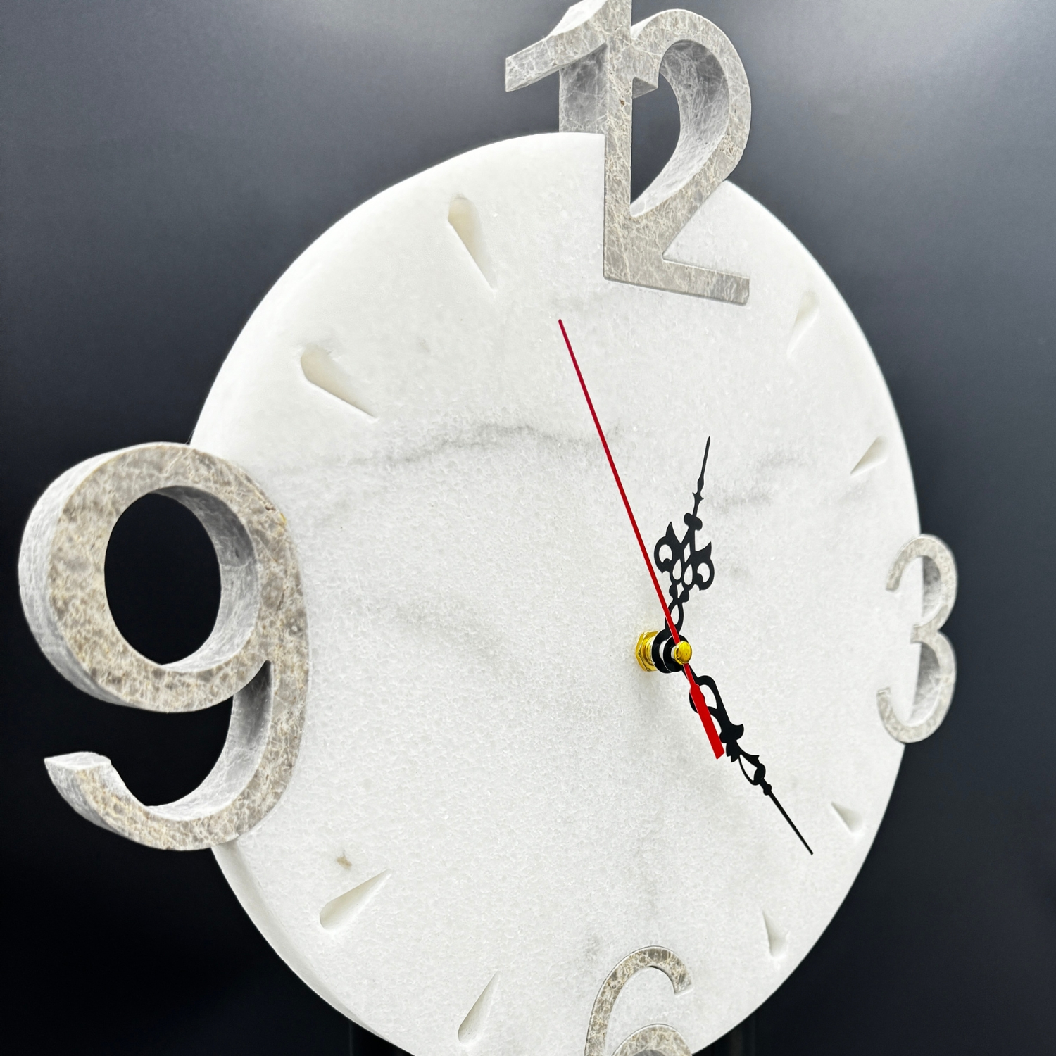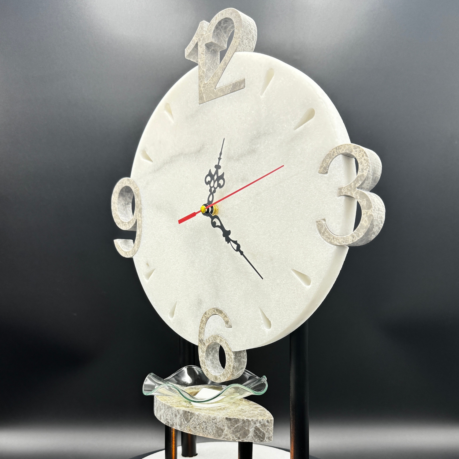 The round marble base supports the clock with sleek black metal poles, providing a sturdy yet stylish foundation. The clock face, made from the same beautiful marble, features minimalist numerals and intricate clock hands that add a touch of sophistication.
