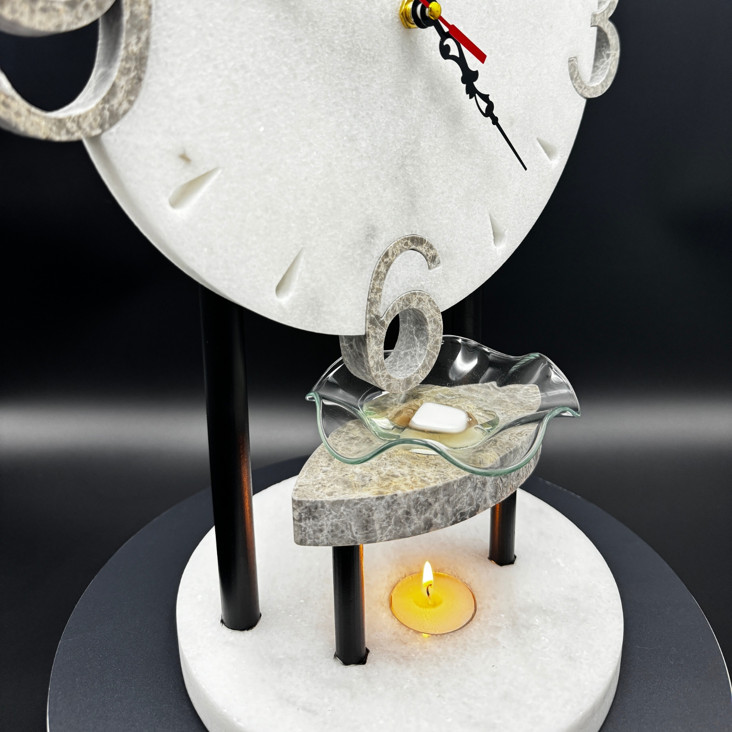 Elevate the ambiance of your space with the Tranquil Vision Clock & Oil Burner. This exquisite tabletop clock is not just a timepiece but a piece of art and serenity. Crafted from the stunning Moon White marble, renowned for its serene white base adorned with delicate grey streaks, this clock exudes elegance and tranquility.