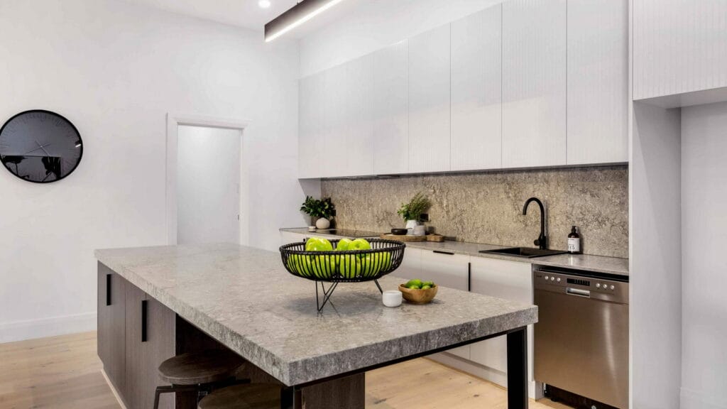 Crafted from a sustainable blend of natural minerals and recycled materials, Turbine Grey is crystalline silica-free, meeting modern health and safety standards. It’s ideal for a variety of indoor applications including kitchen benchtops, bathroom vanities, and feature walls, combining aesthetic beauty with practical durability. Its non-porous composition ensures resistance to stains, scratches, and heat, offering easy maintenance and lasting performance.