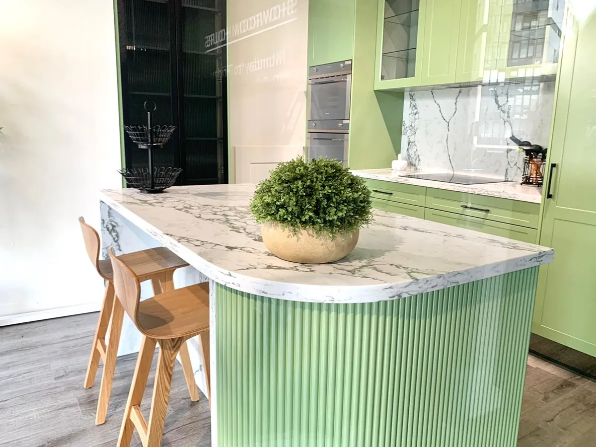Verde Fantastico from the Quantum Zero Ultra Natural Range is a bold, crystalline silica-free engineered stone that showcases the dramatic allure of rich forest greens accented with sweeping white and earthy veining. Designed to mimic the movement and colour palette of exotic natural stones, Verde Fantastico is a statement surface ideal for luxury kitchen islands, dramatic splashbacks, and standout commercial interiors. Its combination of visual richness and engineered durability makes it perfect for those seeking both performance and aesthetic impact.